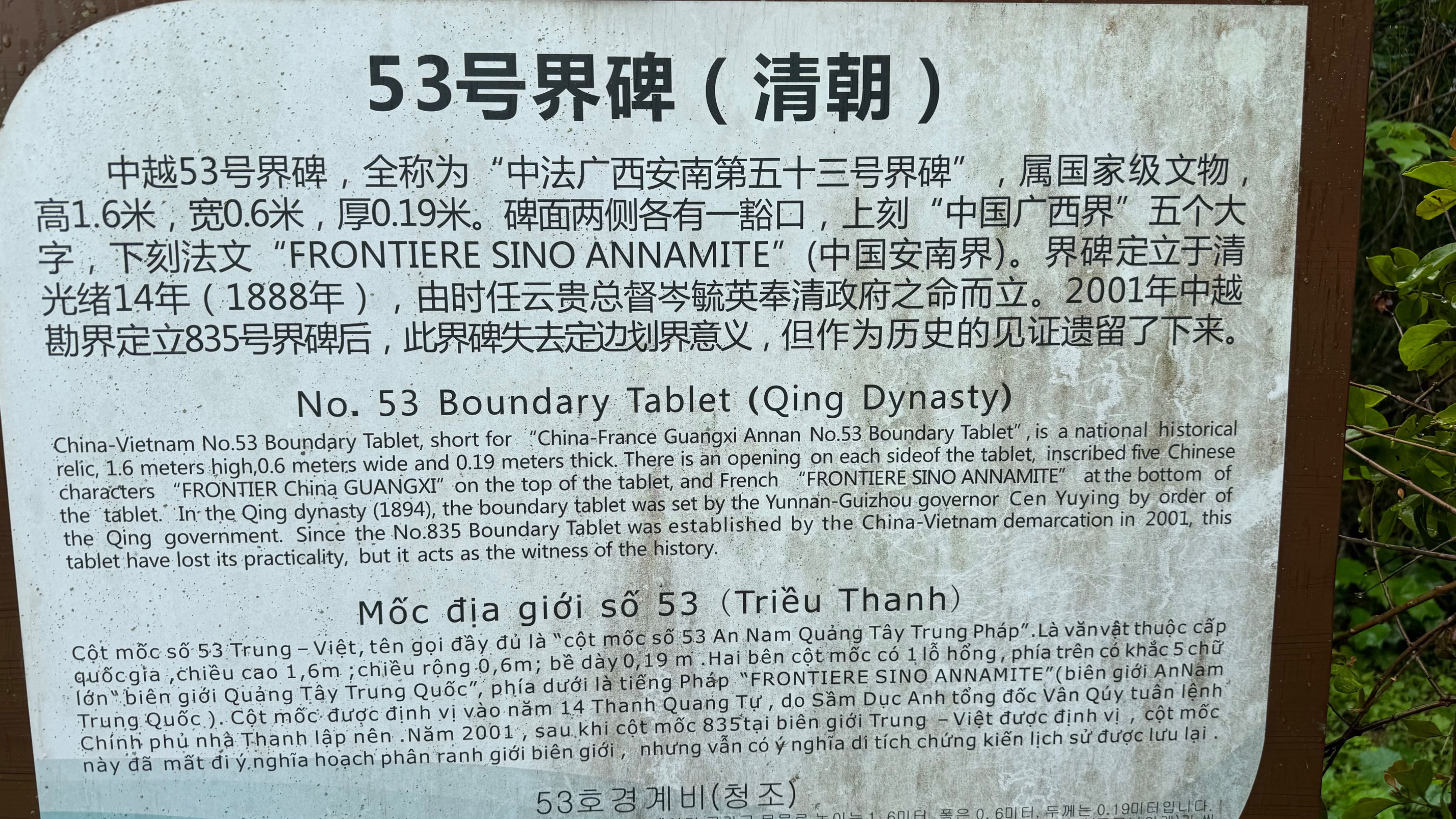 瀑布下面的归春河上,中国的游船和越南的竹筏交错,让两国的经济状况有了一个最直观的体现。下船码头正对着中越边界836号界碑。爬上小山,在靠近瀑布的观瀑台小坐片刻,喝一杯冰凉的越南咖啡,我们继续西行,很快就在景区美食城旁边看到了被栏杆围起来的清末中越53号界碑和现在的中越边界835号界碑。53号界碑全称中法广西安南第五十三号界碑,上刻中文“中国广西界”,下刻法文。清光绪十四年,云贵总督岑毓英奉命立碑。2001年,中越边界835号界碑定立后,老碑失去划界意义,却仍然庄严矗立,宛如老兵。