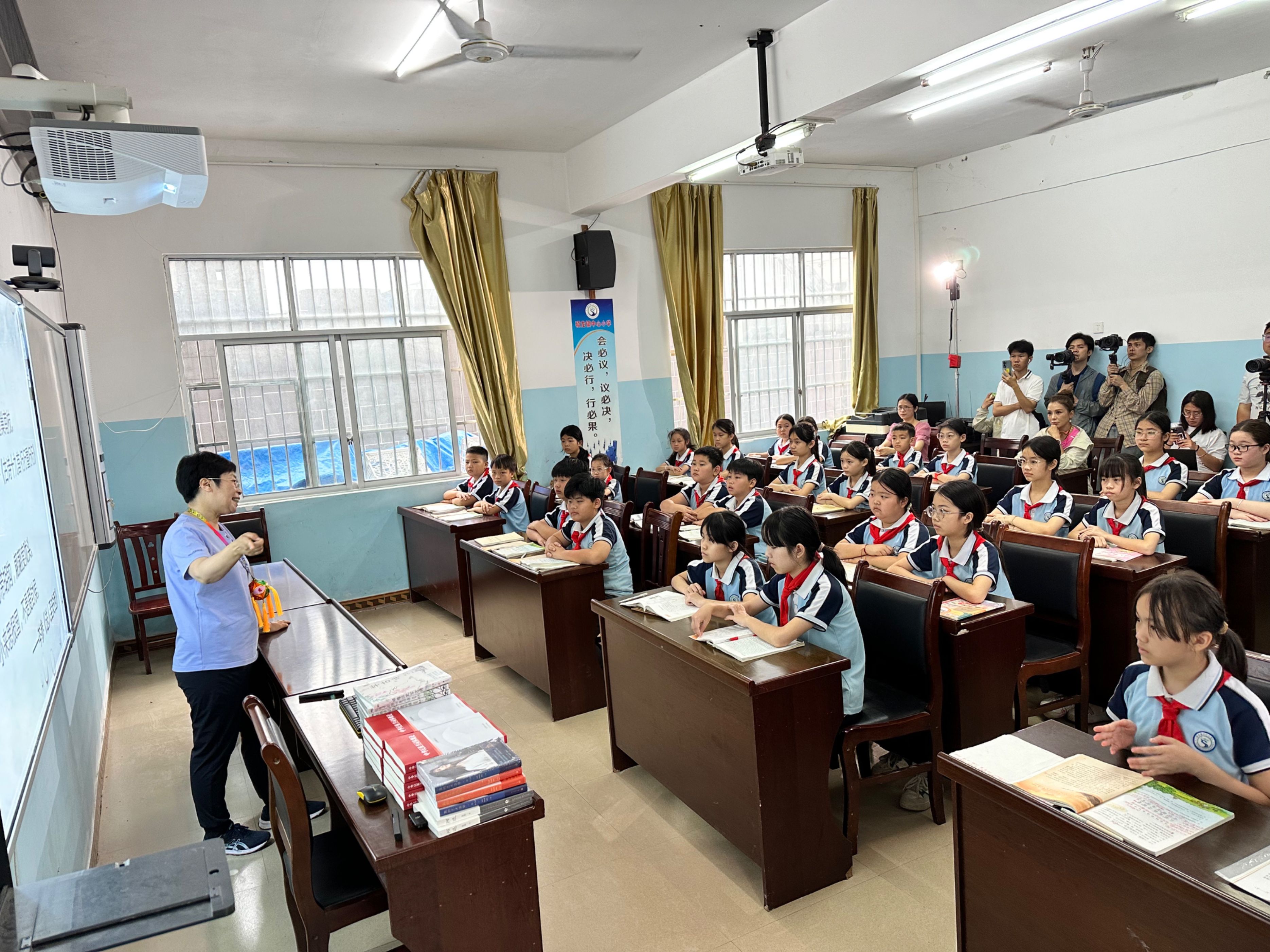 清晨,明仕村在大雾中醒来。厚厚的云层压过头顶,也拢住了峰林。上午的第一站,是归春河畔的硕龙镇中心小学。一夜大雨,铺着塑胶跑道的操场还有积水斑驳的痕迹。教学楼前,介绍大新古迹遗址的宣传板排成一排。生活在边境小城的孩子们,从小就了解了苏元春防线和南疆边关的历史。在这里,我给五年级的孩子们讲了一堂与诗词有关的支教课。我希望孩子们不但要庄敬自强,还要有一颗善于辨别真善美的敏感心灵。