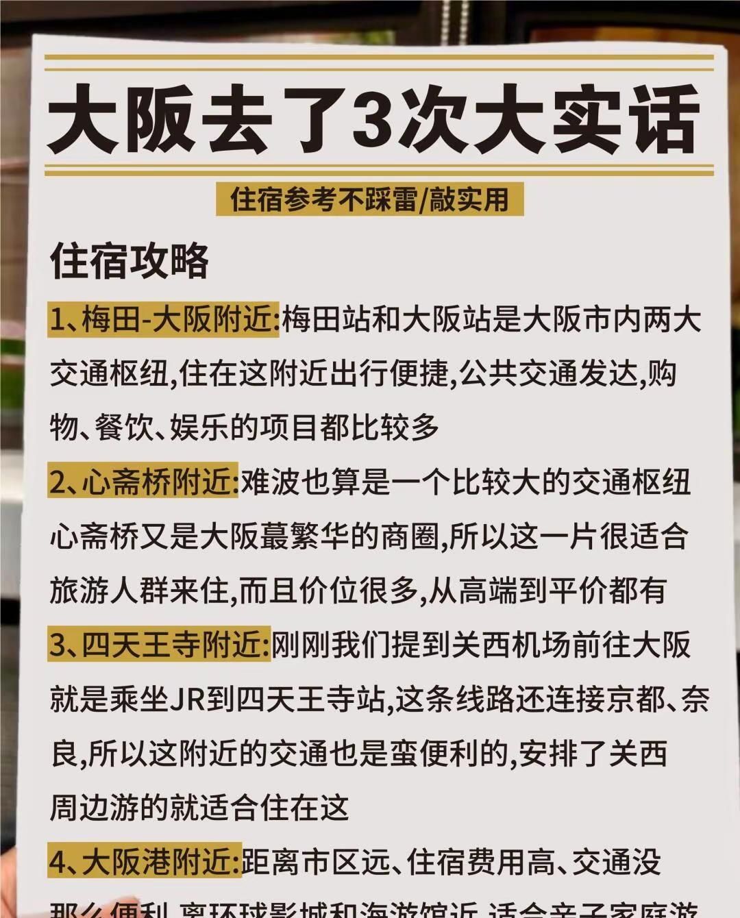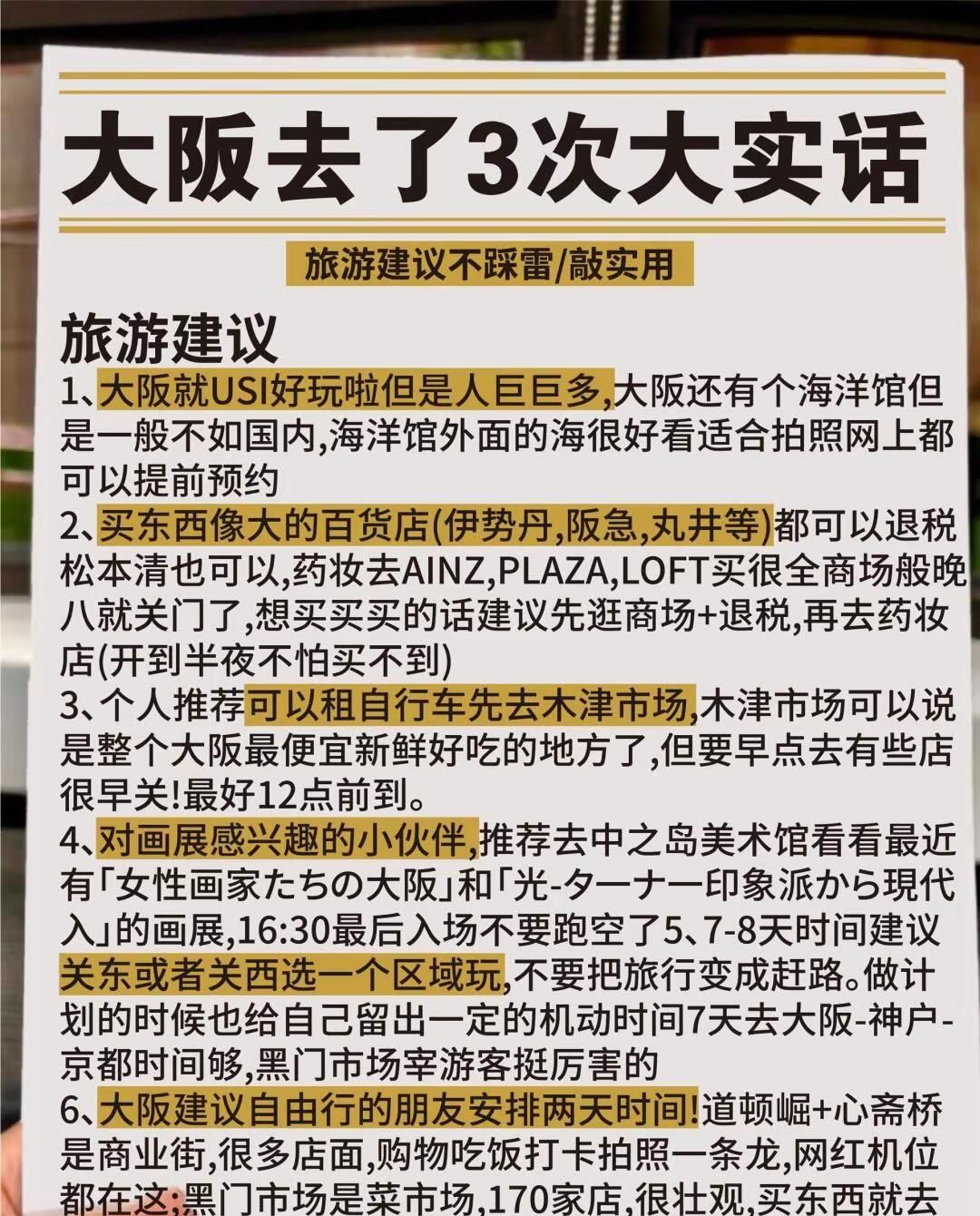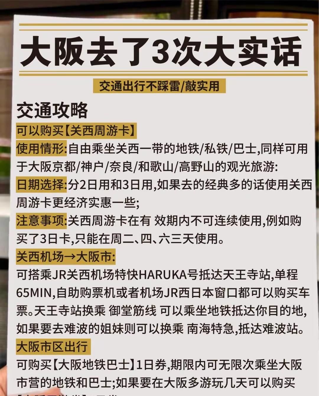 2-5来大阪旅游,土著整理景点红黑。写给2-5要来大阪旅游的朋友,本土著真的不想看到大家在被网上花里胡哨的攻略欺骗了,特地把自己的经验总结分享给大家!-大阪交通大阪市地铁:大阪市地铁共有9条线路,每条线路都有其特定的颜色和标识,可以使用“大阪地铁一日券”主要车站:梅田站、难波站、心斋桥站、天王寺站、本町站等JR:市区内以大阪环状线为主,环绕大阪市中心,连接大阪主要的旅游景点,以及JR关西机场线主要车站:大阪站、新大阪站、天王寺站、京桥站、大阪城公园站等私铁:去关西其他城市非常方便阪急电铁:连接大阪(梅田)与京都、神户等地阪神电铁:连接大阪(梅田/難波)与神户南海电铁:连接大阪市中心(難波)与关西机场、和歌山近铁电铁:连接大阪(梅田/難波/天王寺)与奈良、伊势-住宿参考梅田·大阪区域:交通枢纽,出行便捷心斋桥·道顿堀·难波区域:适合所有旅游人群,从高端到平价关西机场区域:中国飞大阪的航班都会在此降落天王寺区域:连接关西机场、京都、奈良-景点打卡大阪城公园:大阪的标志性建筑之一,具有悠久的历史和文化意义通天阁:标志性建筑,可俯瞰大阪市景,可以逛吃道顿堀&心斋桥:购物和美食中心,有各种餐馆、商店和娱乐设施日本环球影城:各种心跳刺激的游乐项目,还有人气IP的表演秀等-包车行程推荐大阪市区休闲包车1日游路线大阪出发-通天阁-大阪城公园-道顿掘-心斋桥-返回大阪市区-大阪京都1日大阪出发-伏见稻荷大社-清水寺-三年坂二年坂-金阁寺-返回大阪-大阪宇治奈良1日大阪出发-奈良公园-东大寺-春日大社-平等院-返回大阪市区-大阪神户温泉1日大阪出发-神户港马赛克摩天轮-北野异人馆街-有马温泉-六甲山夜景-返回大阪市#日本旅游攻略 #日本包车 #日本包车旅游 #日本包车接送机 #日本包车服务