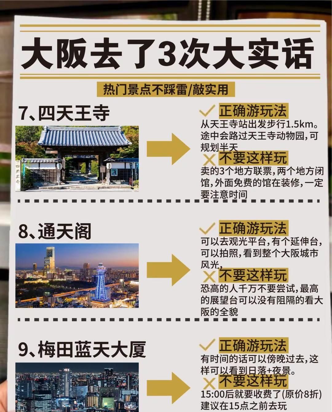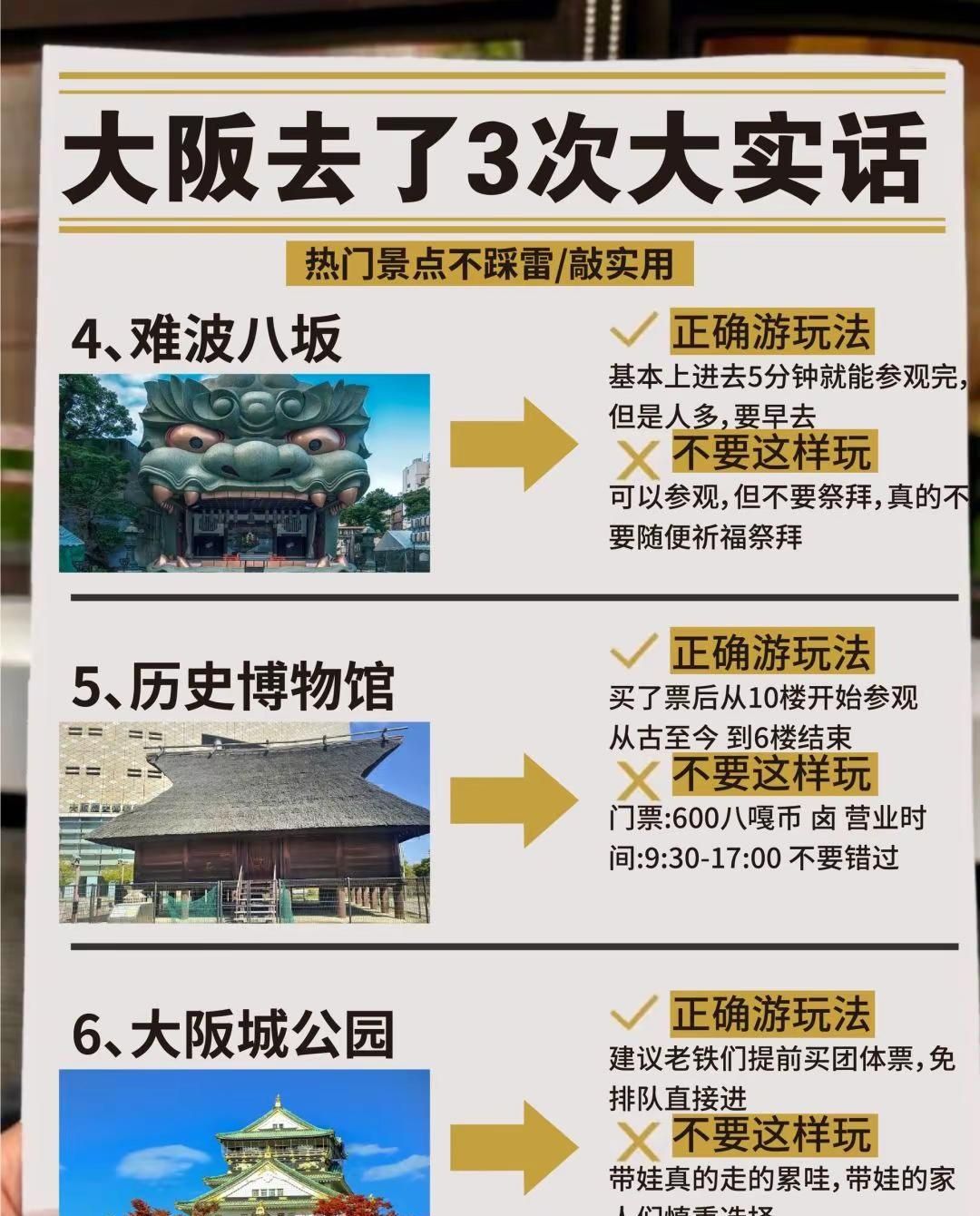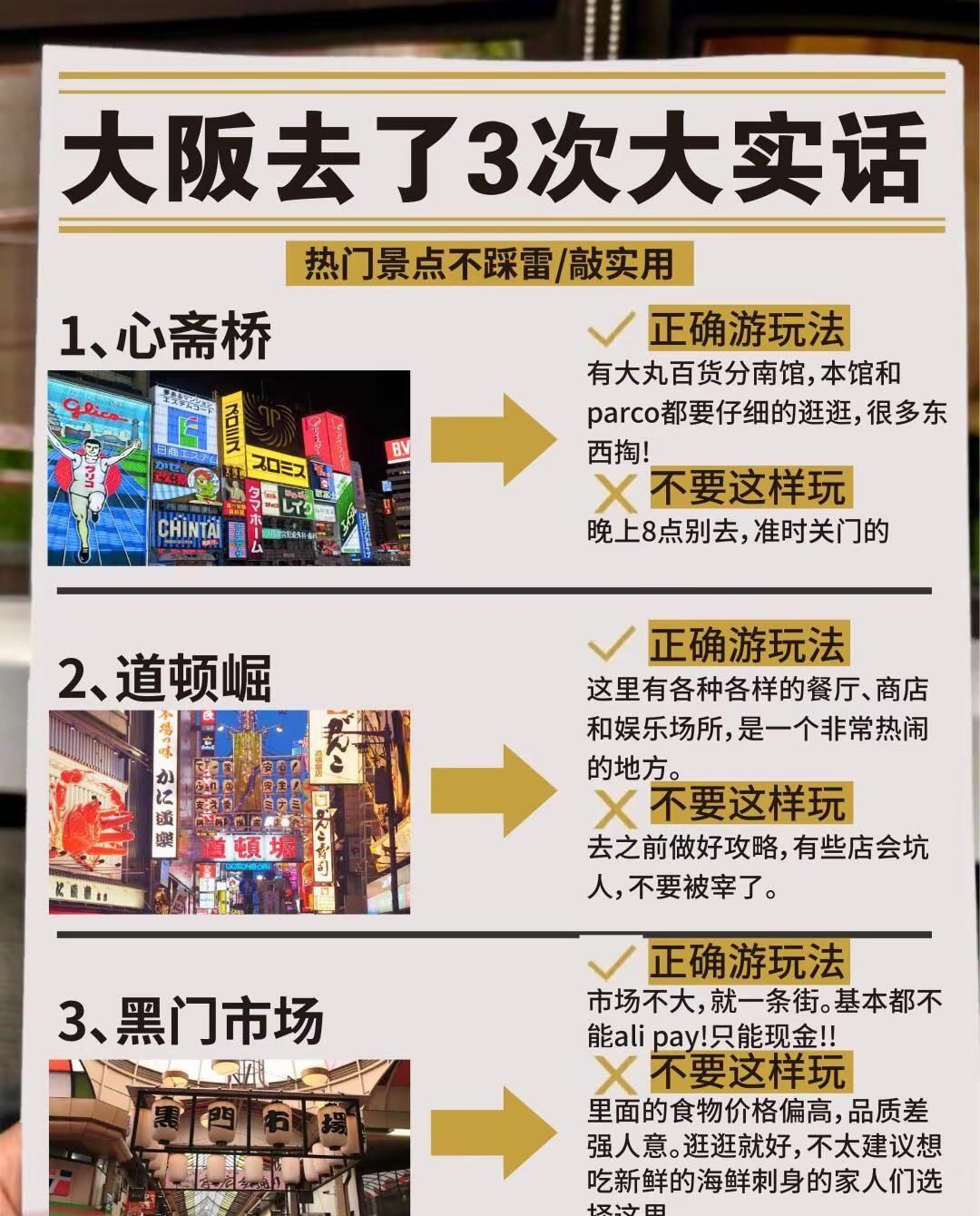 2-5来大阪旅游,土著整理景点红黑。写给2-5要来大阪旅游的朋友,本土著真的不想看到大家在被网上花里胡哨的攻略欺骗了,特地把自己的经验总结分享给大家!-大阪交通大阪市地铁:大阪市地铁共有9条线路,每条线路都有其特定的颜色和标识,可以使用“大阪地铁一日券”主要车站:梅田站、难波站、心斋桥站、天王寺站、本町站等JR:市区内以大阪环状线为主,环绕大阪市中心,连接大阪主要的旅游景点,以及JR关西机场线主要车站:大阪站、新大阪站、天王寺站、京桥站、大阪城公园站等私铁:去关西其他城市非常方便阪急电铁:连接大阪(梅田)与京都、神户等地阪神电铁:连接大阪(梅田/難波)与神户南海电铁:连接大阪市中心(難波)与关西机场、和歌山近铁电铁:连接大阪(梅田/難波/天王寺)与奈良、伊势-住宿参考梅田·大阪区域:交通枢纽,出行便捷心斋桥·道顿堀·难波区域:适合所有旅游人群,从高端到平价关西机场区域:中国飞大阪的航班都会在此降落天王寺区域:连接关西机场、京都、奈良-景点打卡大阪城公园:大阪的标志性建筑之一,具有悠久的历史和文化意义通天阁:标志性建筑,可俯瞰大阪市景,可以逛吃道顿堀&心斋桥:购物和美食中心,有各种餐馆、商店和娱乐设施日本环球影城:各种心跳刺激的游乐项目,还有人气IP的表演秀等-包车行程推荐大阪市区休闲包车1日游路线大阪出发-通天阁-大阪城公园-道顿掘-心斋桥-返回大阪市区-大阪京都1日大阪出发-伏见稻荷大社-清水寺-三年坂二年坂-金阁寺-返回大阪-大阪宇治奈良1日大阪出发-奈良公园-东大寺-春日大社-平等院-返回大阪市区-大阪神户温泉1日大阪出发-神户港马赛克摩天轮-北野异人馆街-有马温泉-六甲山夜景-返回大阪市#日本旅游攻略 #日本包车 #日本包车旅游 #日本包车接送机 #日本包车服务
