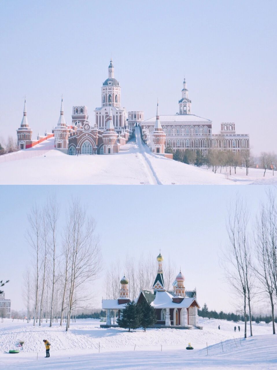 这里是冰雪奇缘童话里的城堡,在离哈尔滨市区25公里的阿什河畔,是以俄罗斯文化为主题的公园,里面有30多座五彩缤纷的城堡,冬天被厚厚的白雪覆盖,里面的道路不铲雪,积雪很深,就像行走在现实版的童话世界里