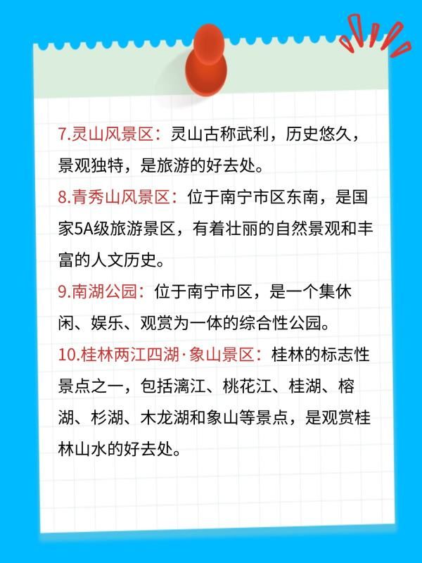 10.桂林两江四湖·象山景区:桂林的标志性景点之一,包括漓江、桃花江、桂湖、榕湖、杉湖、木龙湖和象山等景点,是观赏桂林山水的好去处。