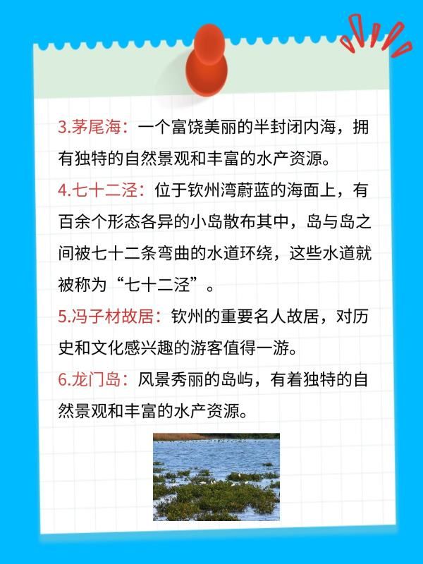 3.茅尾海:一个富饶美丽的半封闭内海,拥有独特的自然景观和丰富的水产资源。