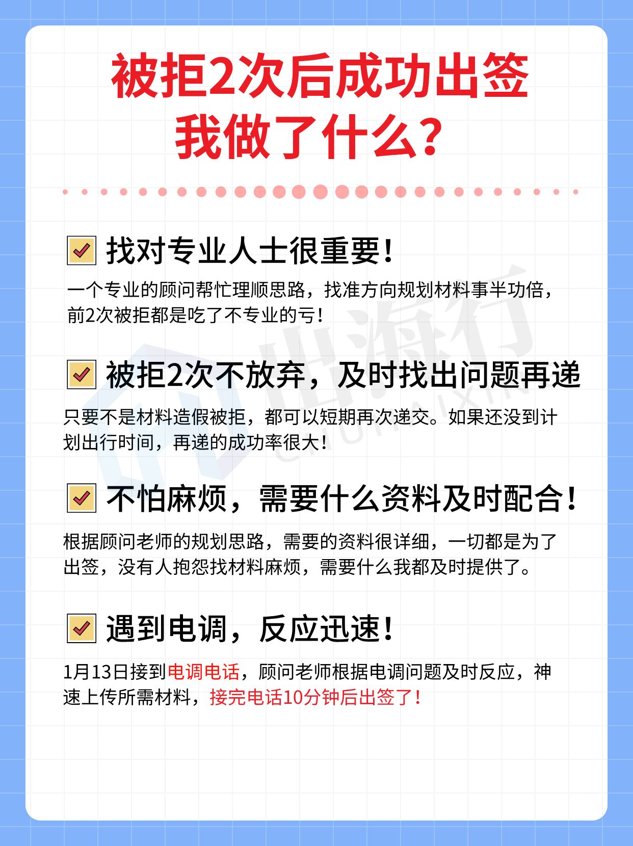 2. 被拒2次不放弃,及时找出问题再递交。只要不是材料造假被拒,都可以短期再次递交。如果还没到计划出行时间,再递的成功率很大!