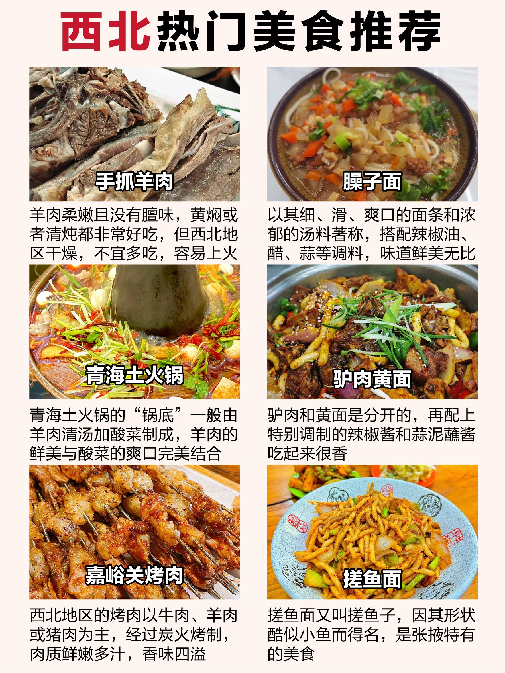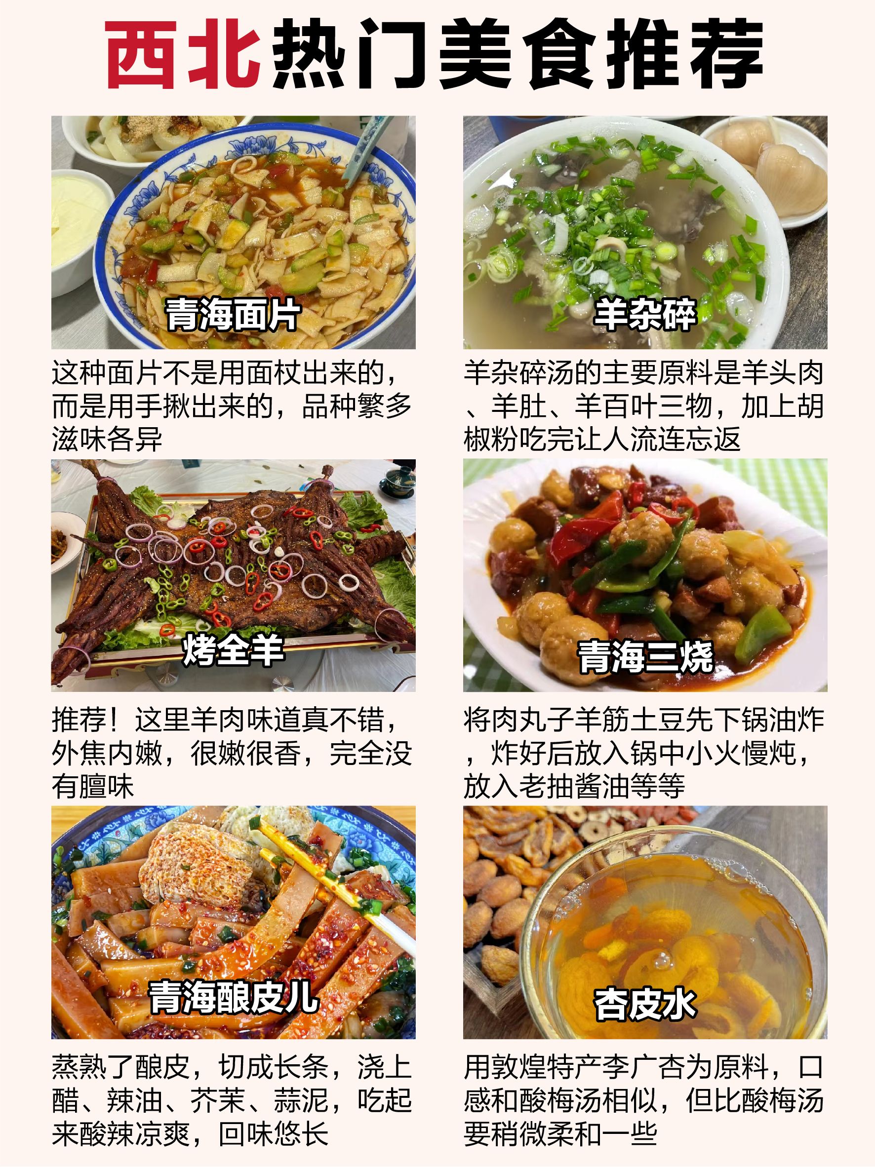 青海酿皮儿、手抓羊肉、青海酸奶、驴肉黄面、羊肉泡馍、烤全羊、炕锅羊肉、青海土火锅