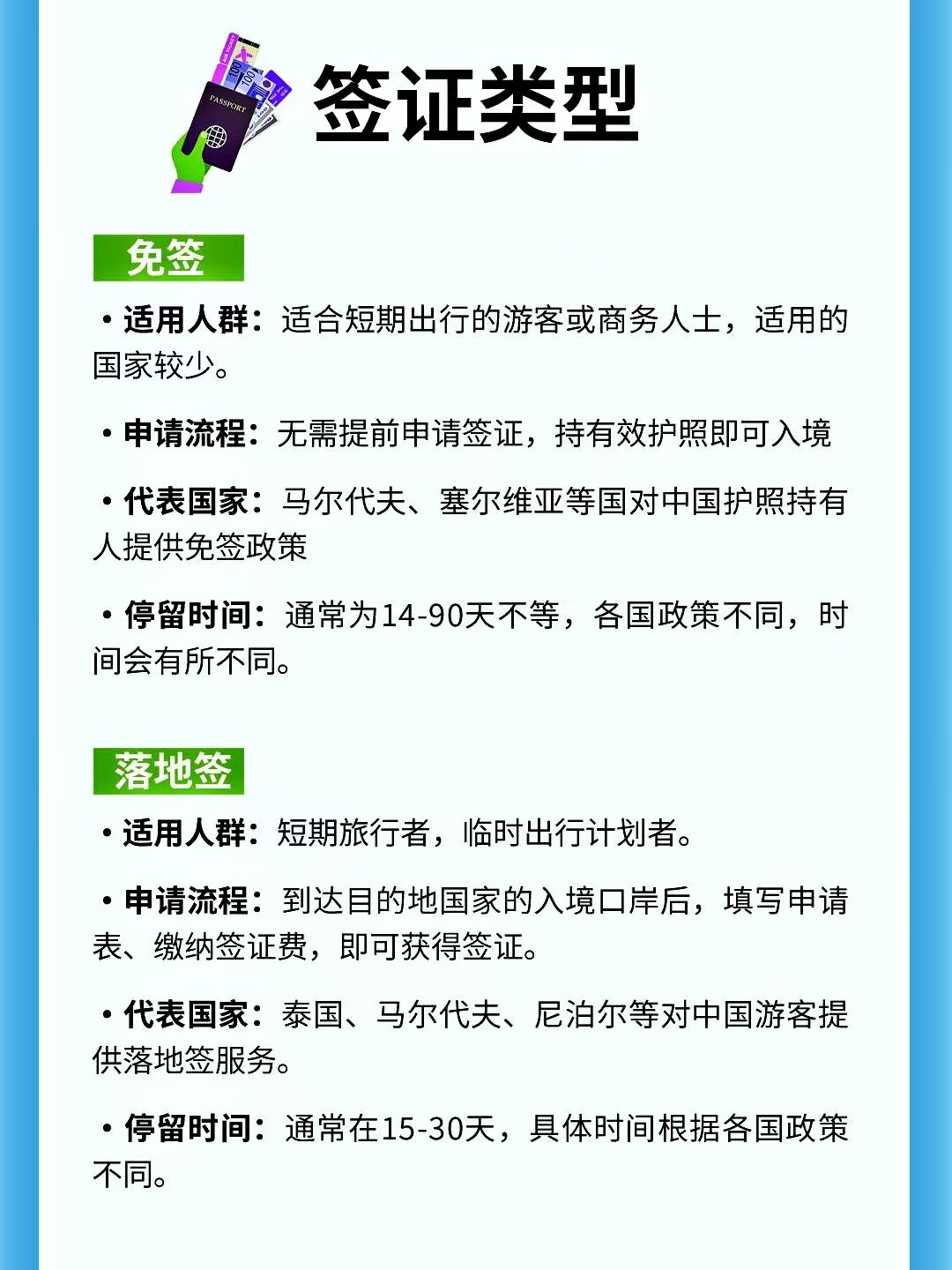 落地签:适用短期旅行者;到达目的地国家入境口岸后,填写申请表缴纳签证费即可;代表国家泰国,马尔代夫等;停留时间通常在15至30天不等