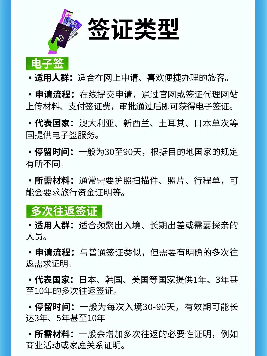 多次往返签证:适合频繁出镜、长期出差的人;需要有多次往返需求证明;代表国家日本、韩国、美国等;停留时间一般为每次入境30-90天,有效期长达5年.10年