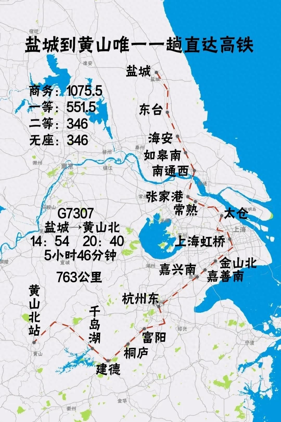 G7307次列车下午14点54分从盐城始发,一路南下,经东台站,海安站,南通西站,常熟站,太仓等站后到达上海虹桥,然后经嘉兴后进入浙江省,到达安徽省后还要停靠千岛湖等站,最终于晚上20点40到达终点黄山北站。