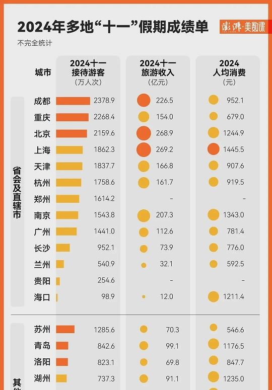 [嘘]国庆大假,哪个城市最火爆?成都,又是成都!凭借2378.9万人的接待量和226.5亿元的旅游收入,成都再次登顶榜单,真是让人刮目相看!要说这份成绩单,简直就是“旅游界的奥斯卡”,让人不禁想问:这座城市究竟凭什么这么火?