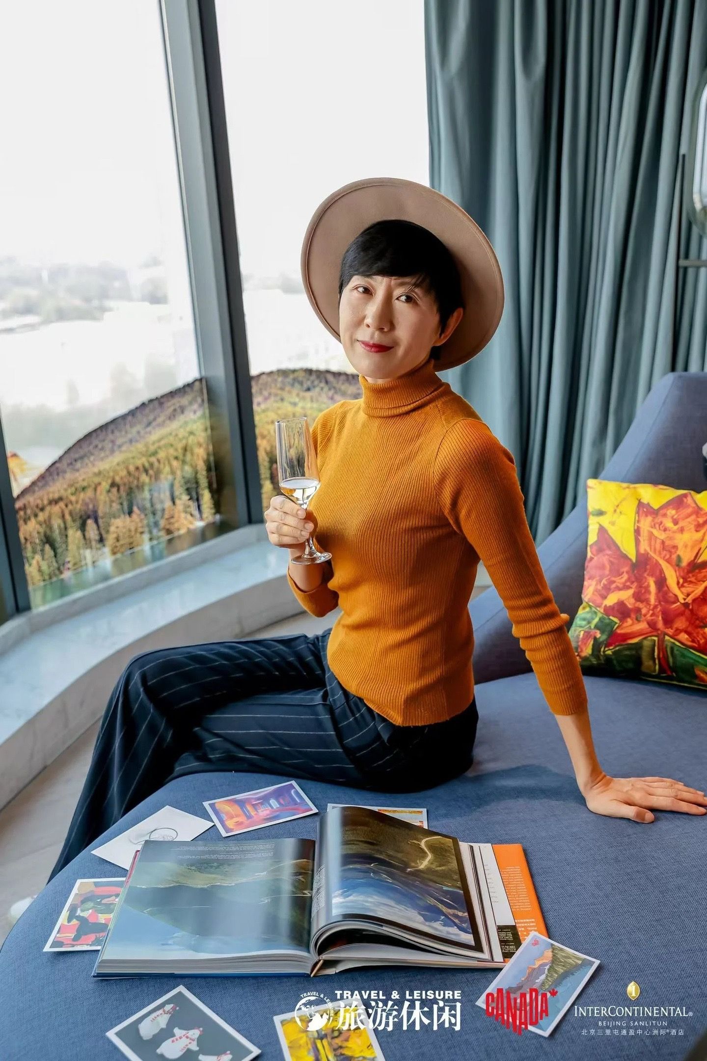 这里不仅可以同样拍到落地窗和十峰山,还融入了更多的加拿大元素。比如前景桌面上努纳武特冰山的风光照,沙发上由艺术家严超为主题房特别创作的画作《丹枫》作为图案的靠枕,或读书、或饮酒、或远眺……怎么拍怎么好看!