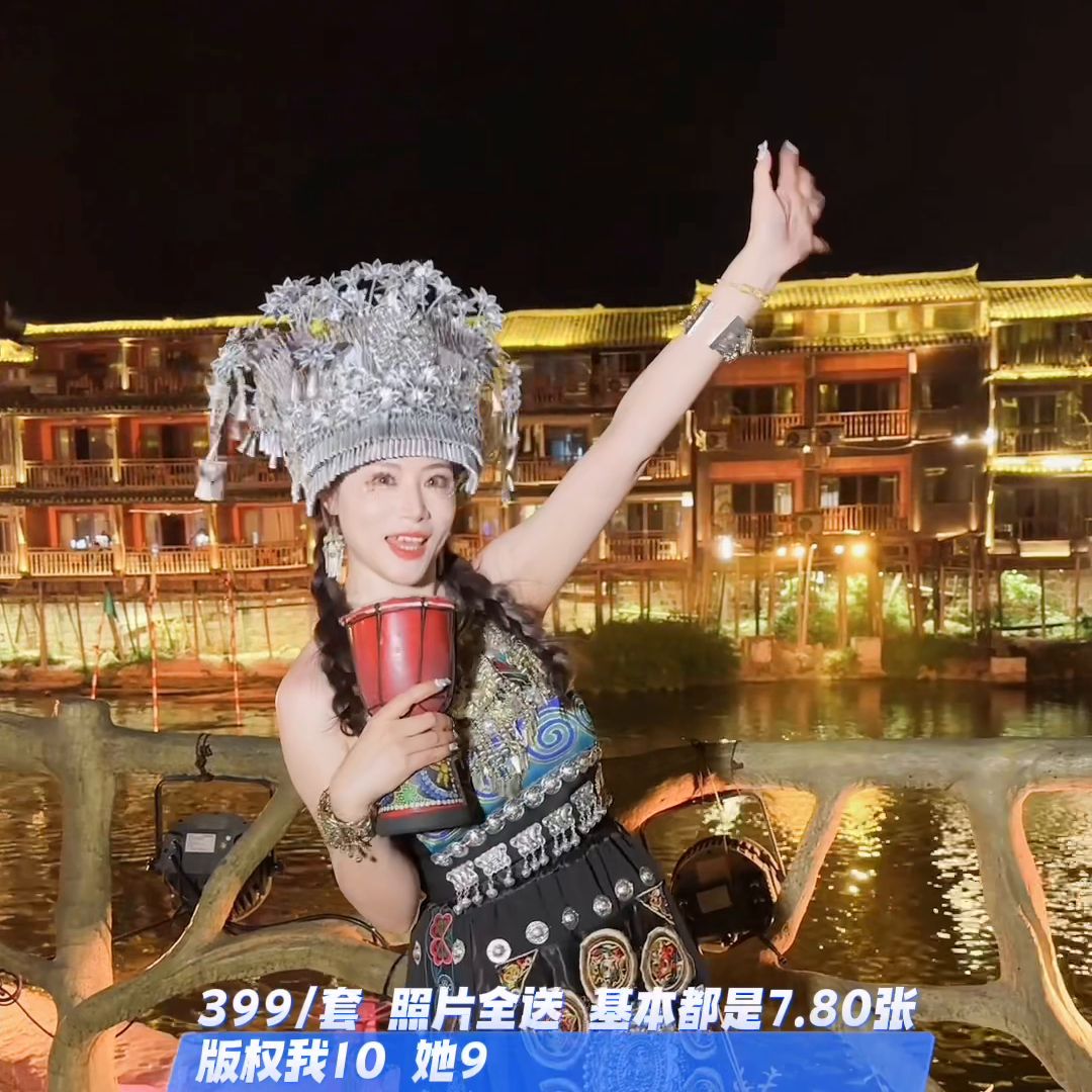 ·第三个就是拍照,这个也是我在抖音和红薯上做了好多攻略,最终选择了这家比较网红的凤凰古城里走两家就有一个化妆的、拍照的。我闺蜜选择的是民宿老板推荐的这家,拍照我俩这价格是一样的,399/套照片全送基本都是7.80张,精修版权,我比他多了一张但是成品效果我觉得我闺蜜的要比我的好,而且它的成片是在拍摄完第二天就给出来了。