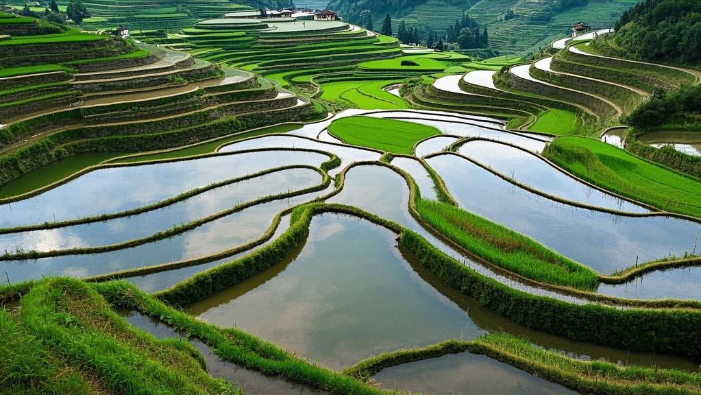 紫鹊界梯田在清明前后进入灌水期,8万亩梯田如镜面镶嵌山间,线条流畅如大地指纹。
