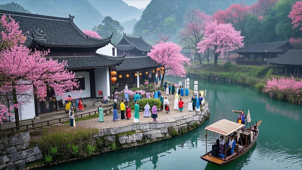 常德桃花源有10万株桃花沿秦溪两岸绽放,配合古风市集、农耕表演,还原《桃花源记》场景。