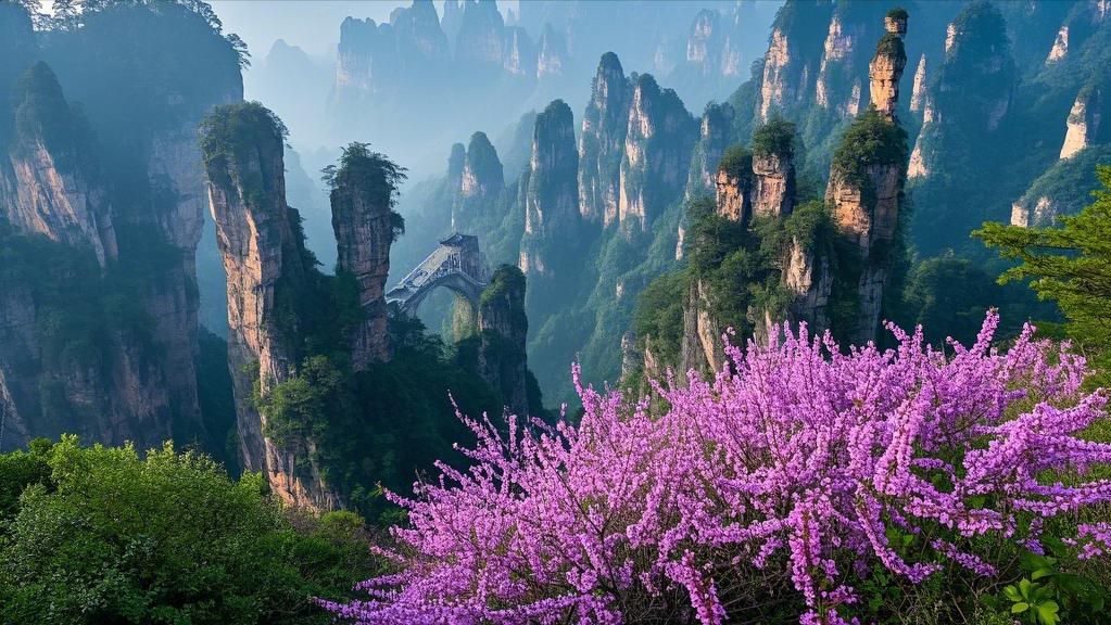 张家界武陵源的奇峰秀水间,樱花与紫云英会盛大开放,宝峰湖、十里画廊的樱花与百丈峡的紫色花毯构成“山水花卷”。