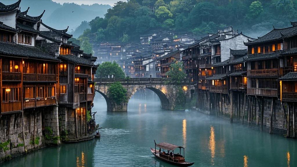 凤凰古城的烟雨沱江与吊脚楼构成水墨画卷,清明细雨更添朦胧诗意。