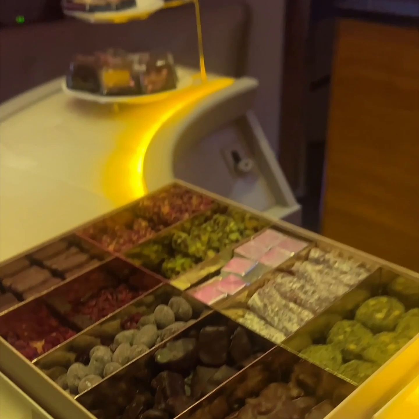 阿联酋航空的牛批之处就在于它的空中酒吧。如果你想喝酒会有专门的工作人员给你调酒,包括它还有迪拜特产的巧克力、什么三明治水果、蛋糕。而且好多人还会专门来这边边唠嗑边喝酒,这个氛围啥的还挺好的,吃也吃了喝也喝了该睡觉了。