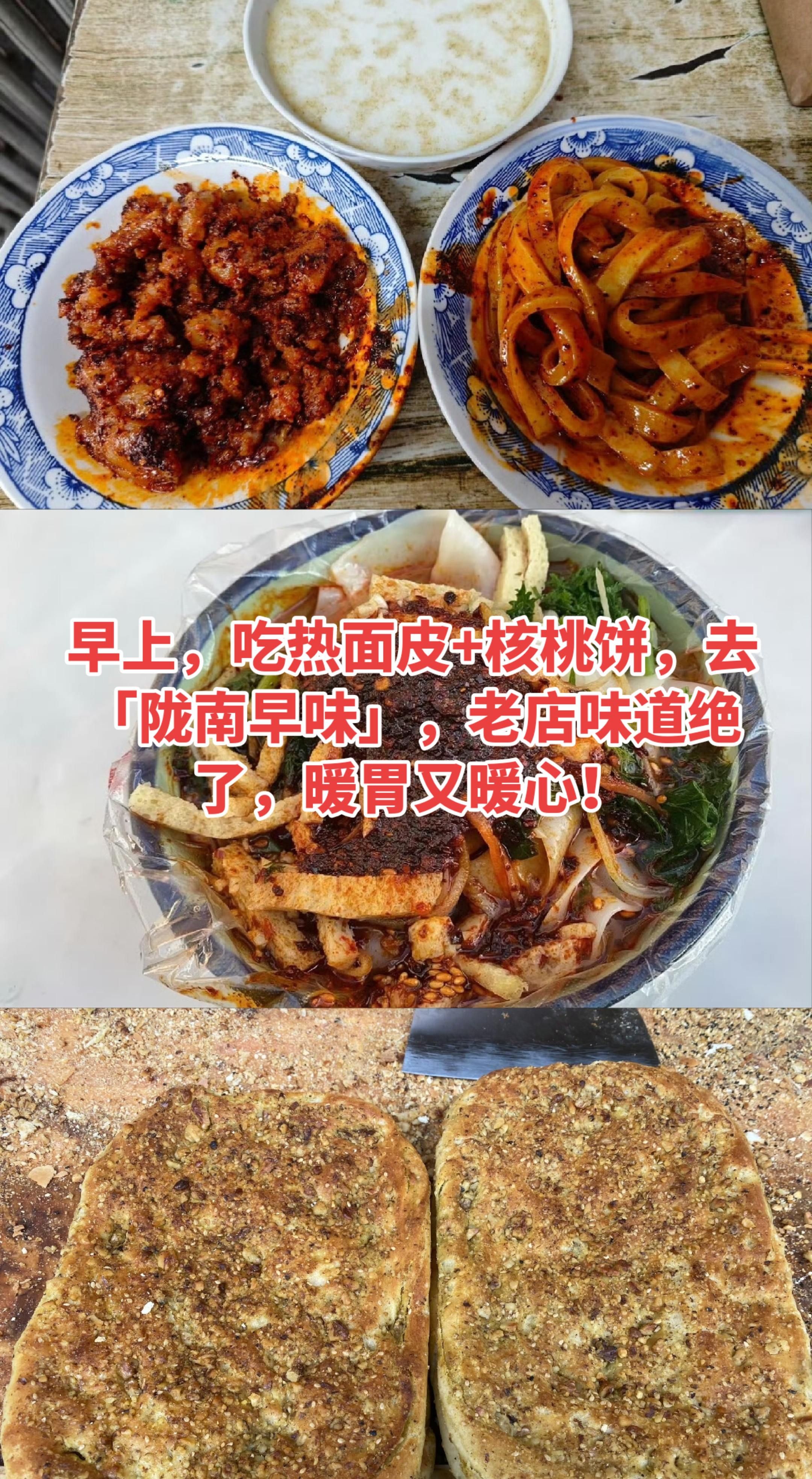 • 上午7点半:早餐吃热面皮+核桃饼,去「陇南早味」,老店味道绝了!暖暖的面皮,香脆的核桃饼,一天的好心情就此开始!