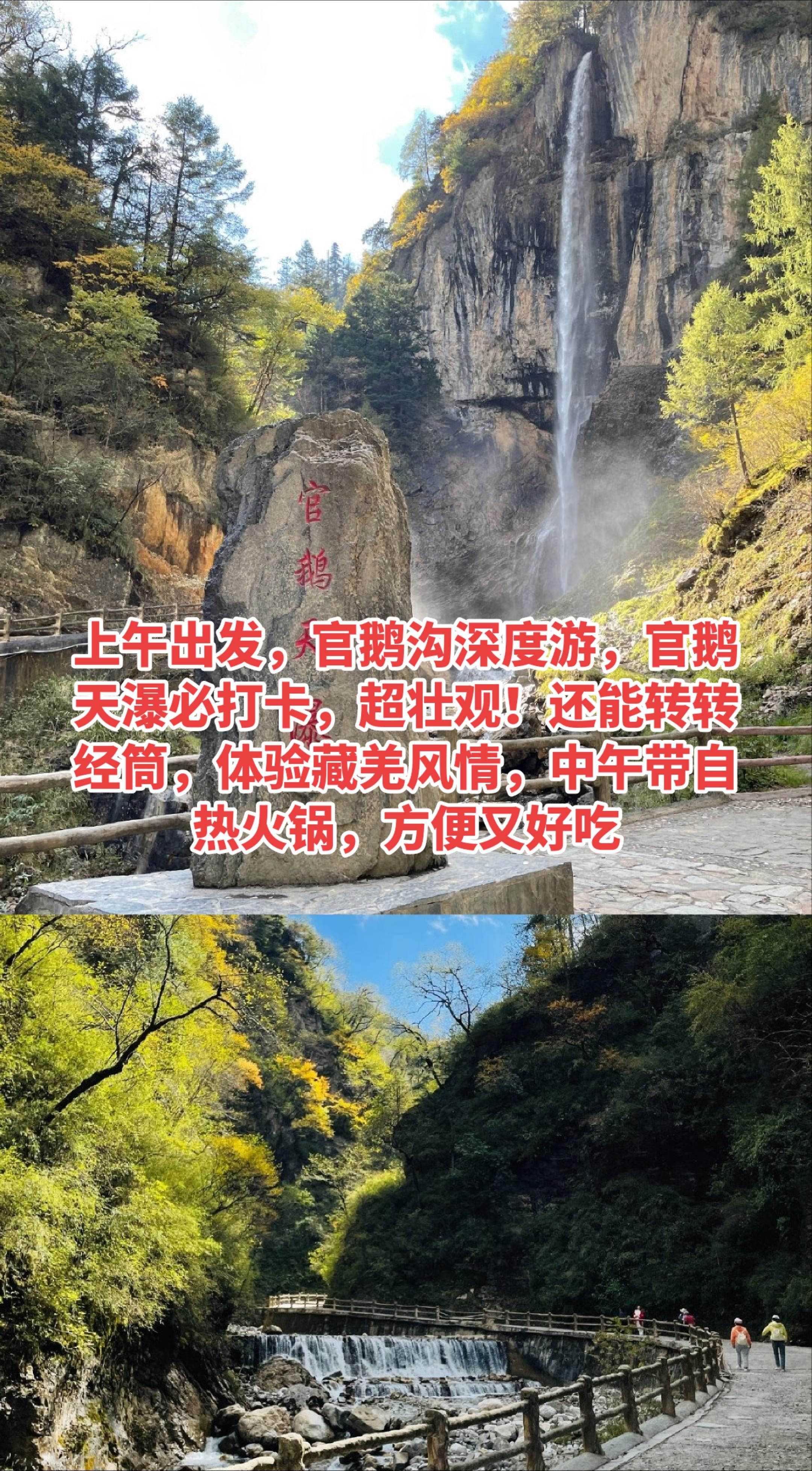 • 上午9点半-中午2点:官鹅沟深度游,官鹅天瀑必打卡,超壮观!还能转转经筒,感受藏羌风情,中午带个自热火锅,方便又好吃!