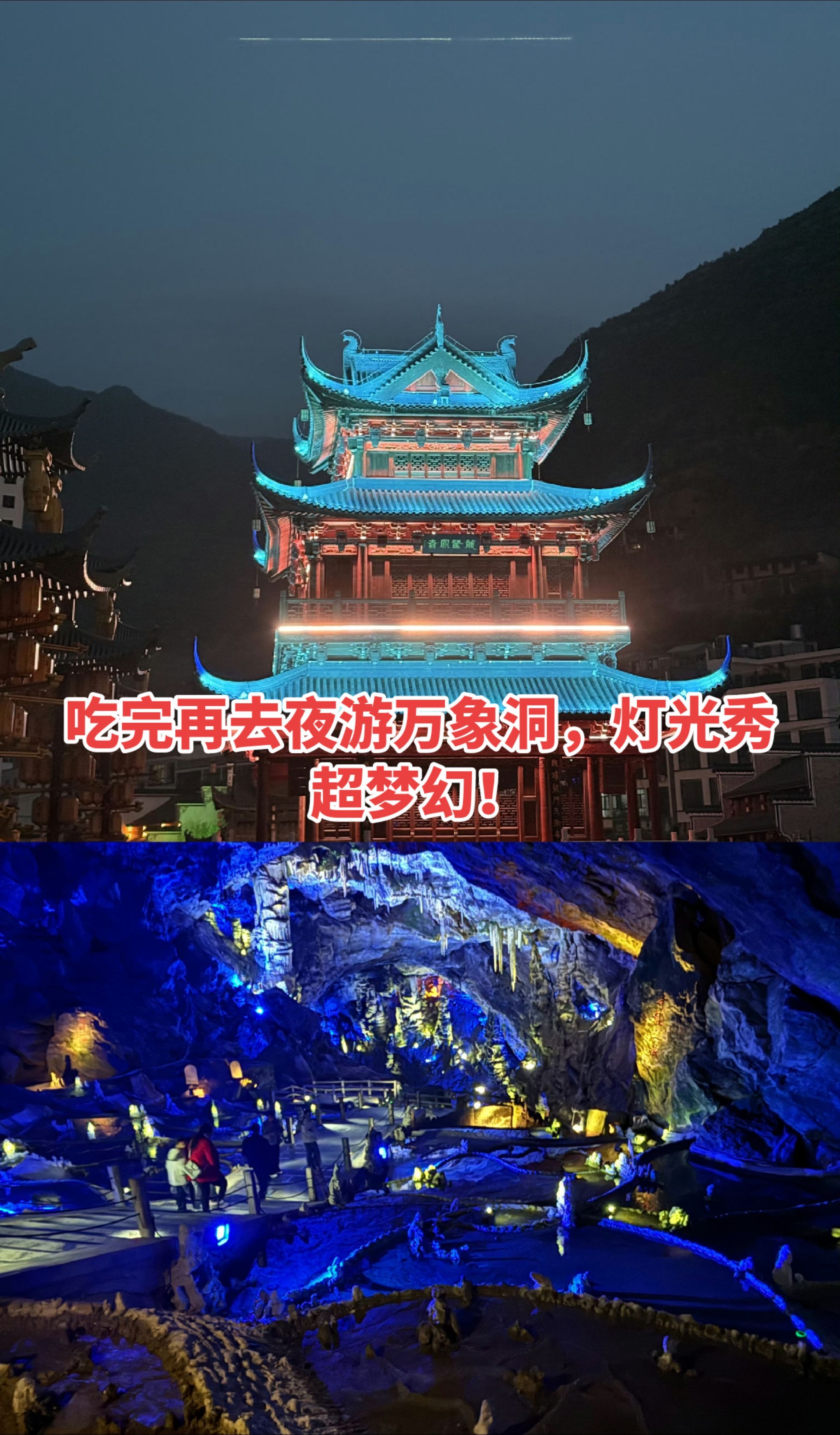 • 晚上8点:夜游万象洞,灯光秀超梦幻,仿佛进了仙境!那一刻,所有的疲惫都烟消云散啦~