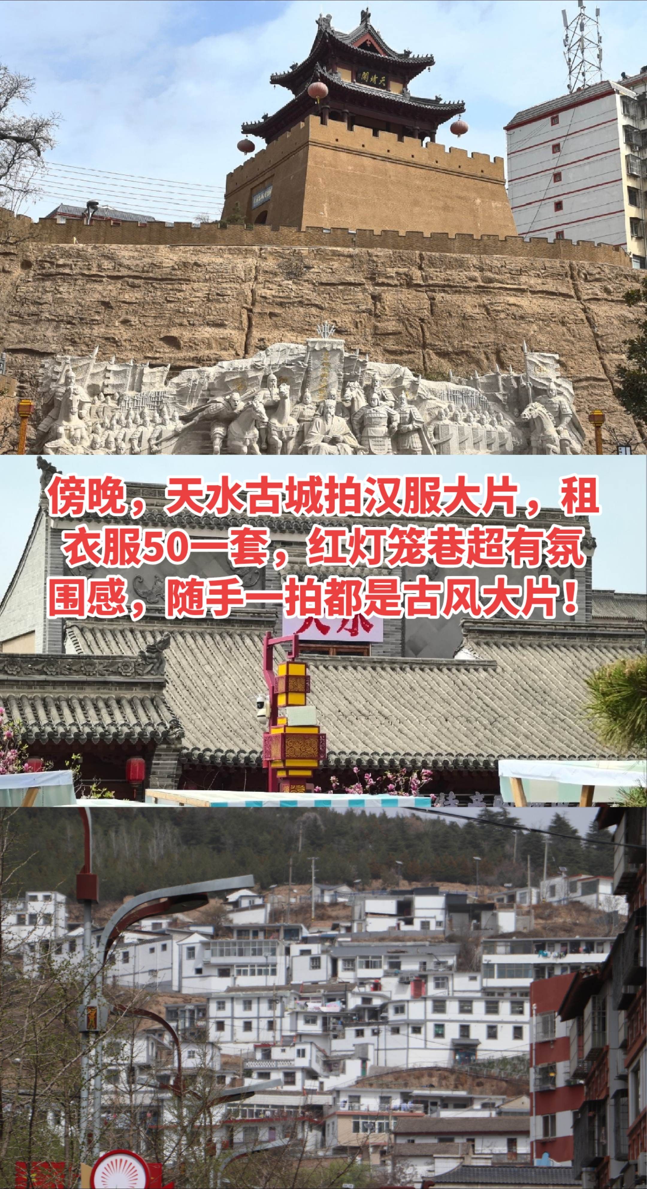 • 下午4点:天水古城拍汉服大片,租衣服50一套,穿越感十足!