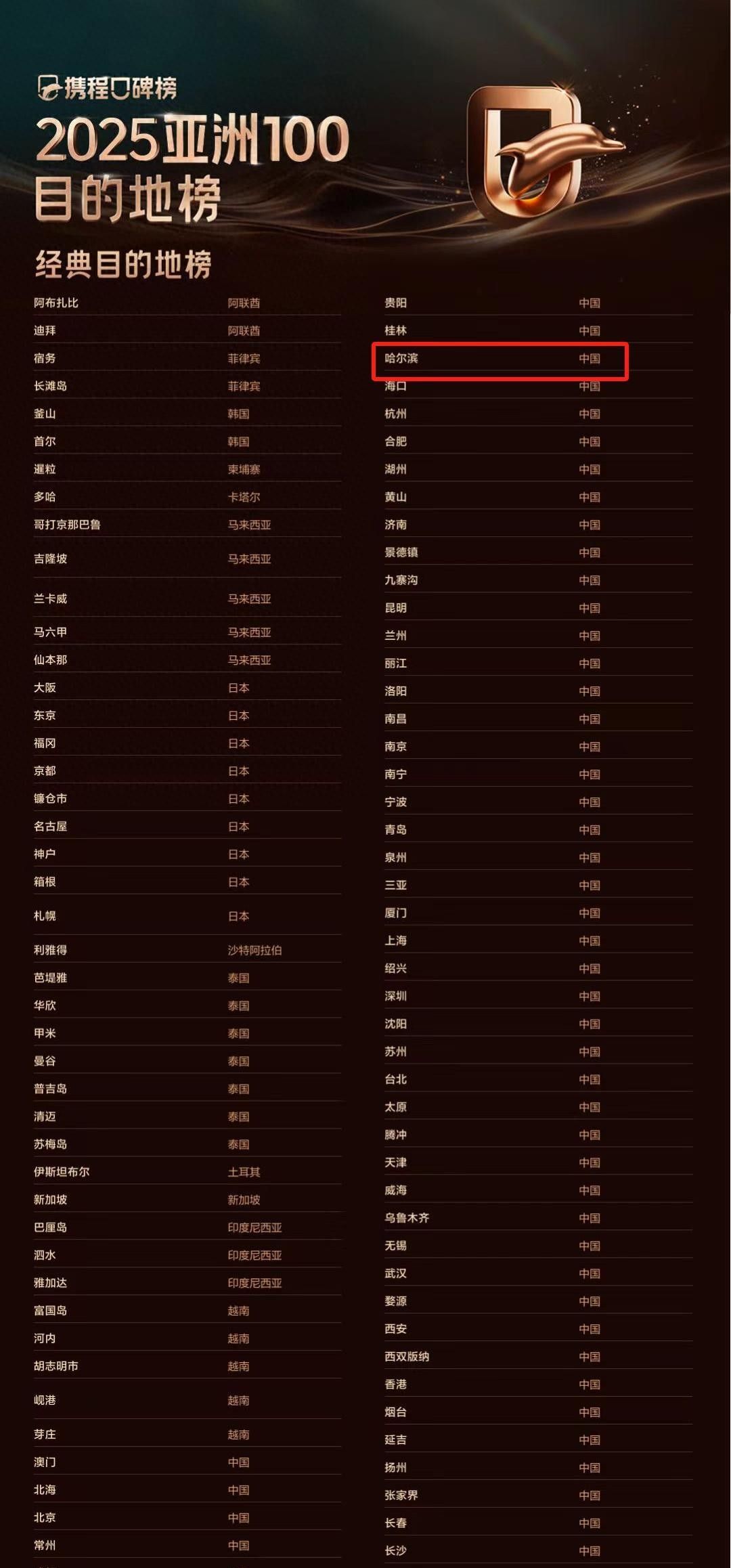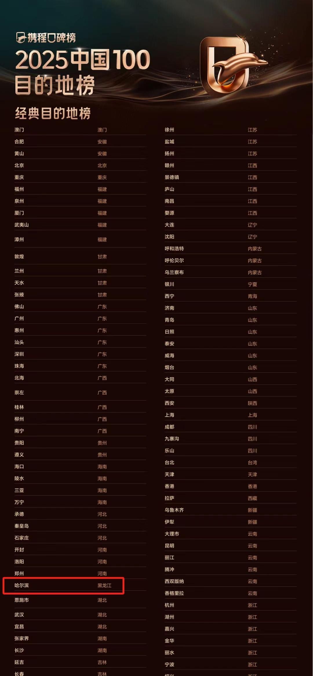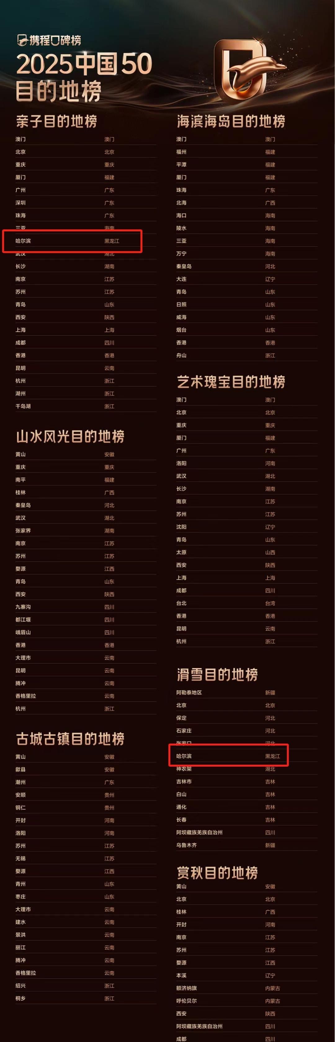 你听说了吗?携程口碑榜2025年度【目的地】榜单新鲜出炉,哈尔滨这城市可是大放异彩,不仅在国内榜上有名,亚洲榜上也赫然在目。这不,亚洲100目的地榜、中国100目的地榜、中国50目的地榜,包括经典目的地榜、亲子目的地榜、滑雪目的榜,哈尔滨都上榜了!