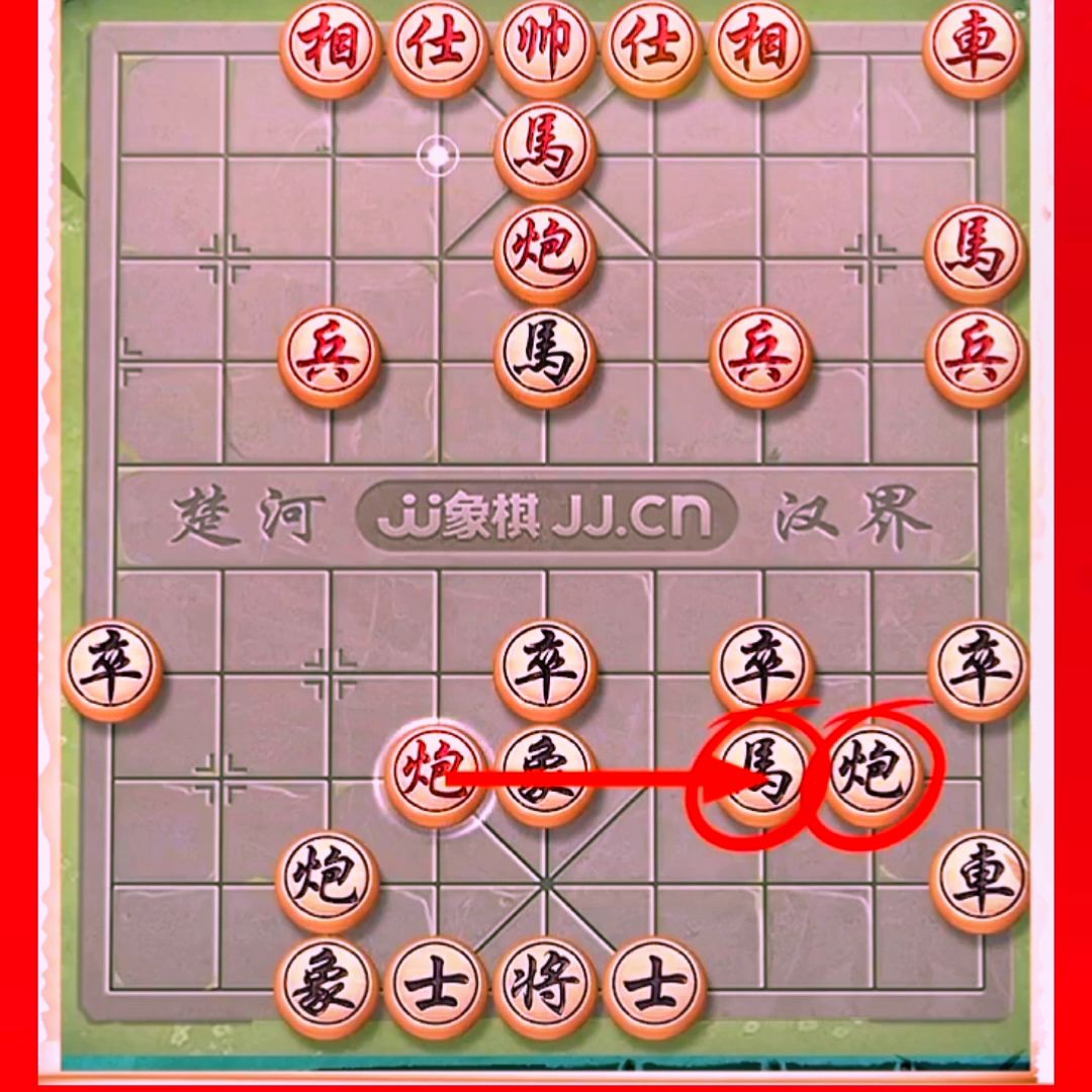 黑方还有妙招,这一步进对马,直插红方腹地,下一步准备强行捉炮打向。红方赶紧退炮打卒,黑方视死如归,迎着炮火前进。将胡弓上弓还是平局捉炮。红炮也不敢打冲,因为黑方仍然有飞炮打向门弓叫杀,这里又要捉狙。