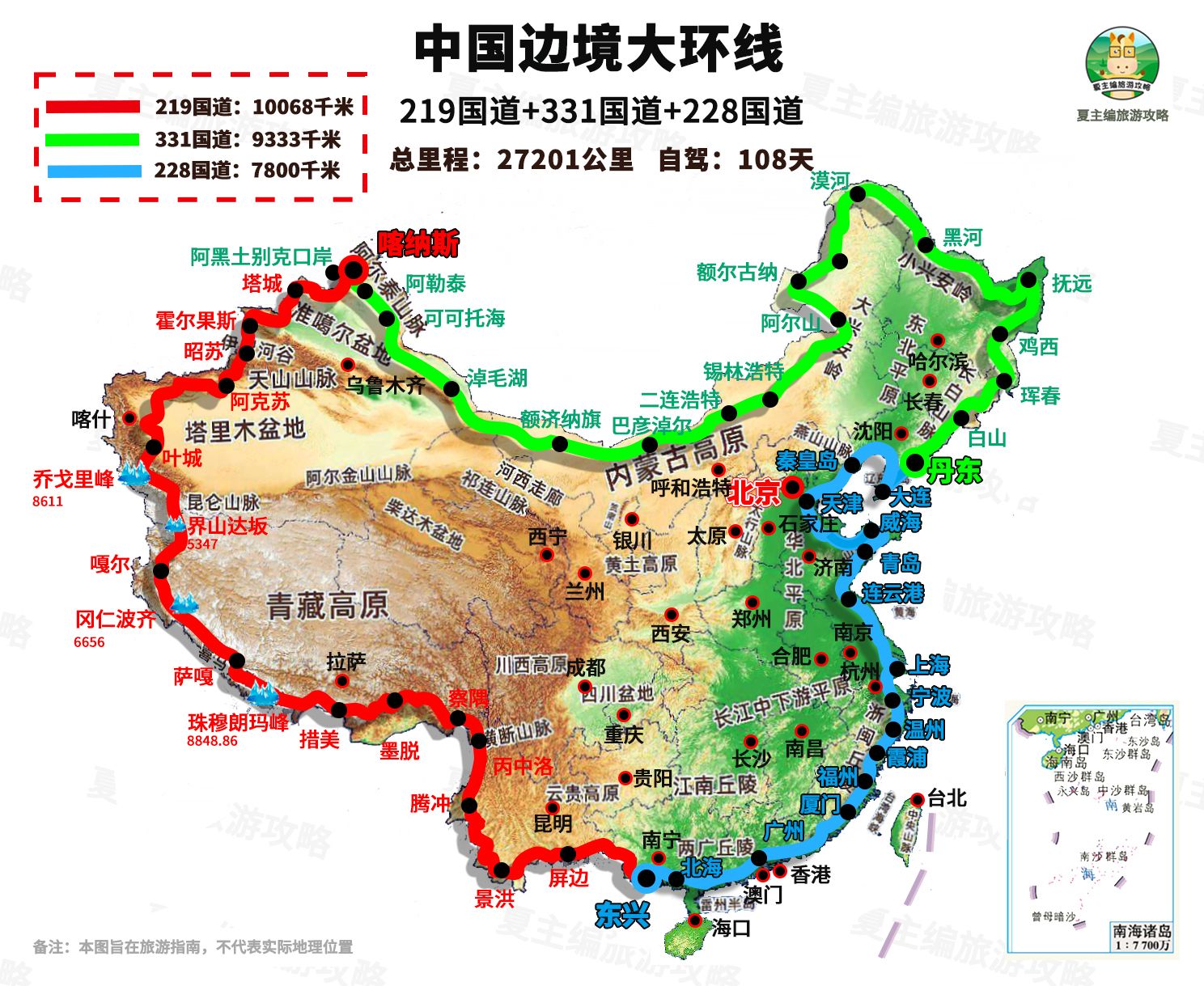 除了219国道的详细途经地高清地图外,夏主编也顺道制作了【中国边境大环线】的线路图,图中简单罗列了另外两条边境公路228国道、331国道的一些途经地、地势地貌,大家可顺道参考。