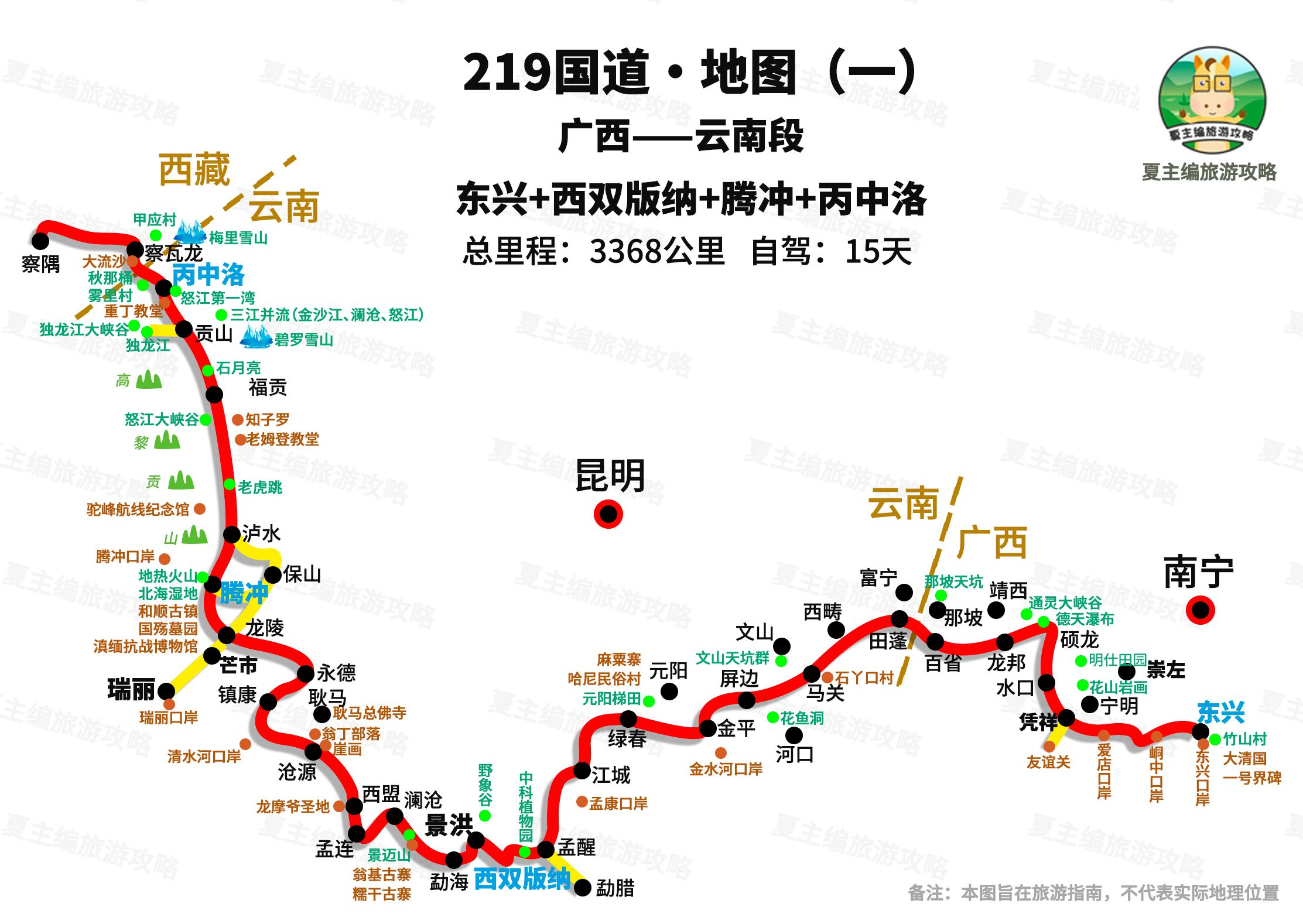 1、广西—云南段:总里程3368公里,自驾约15天。