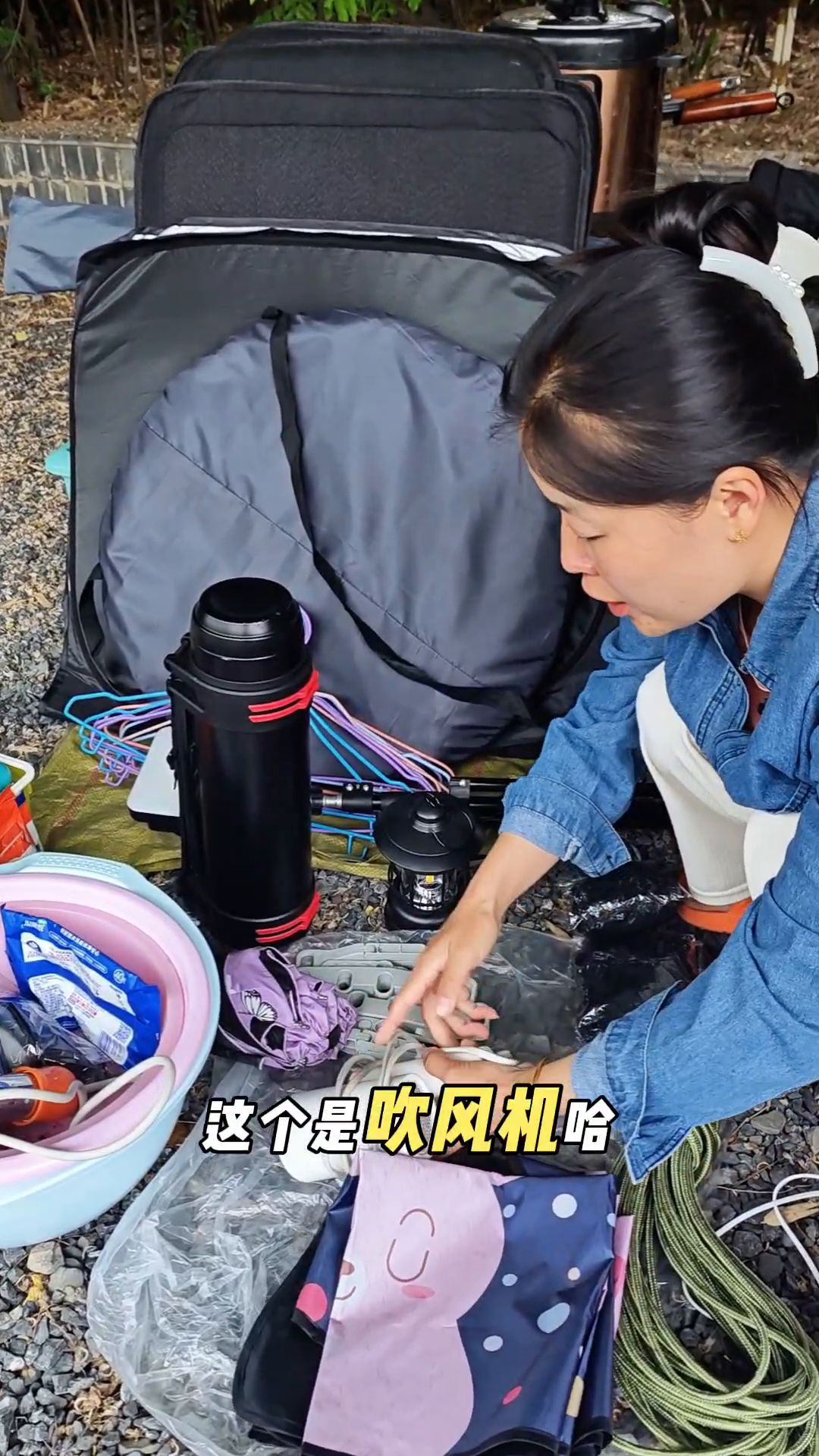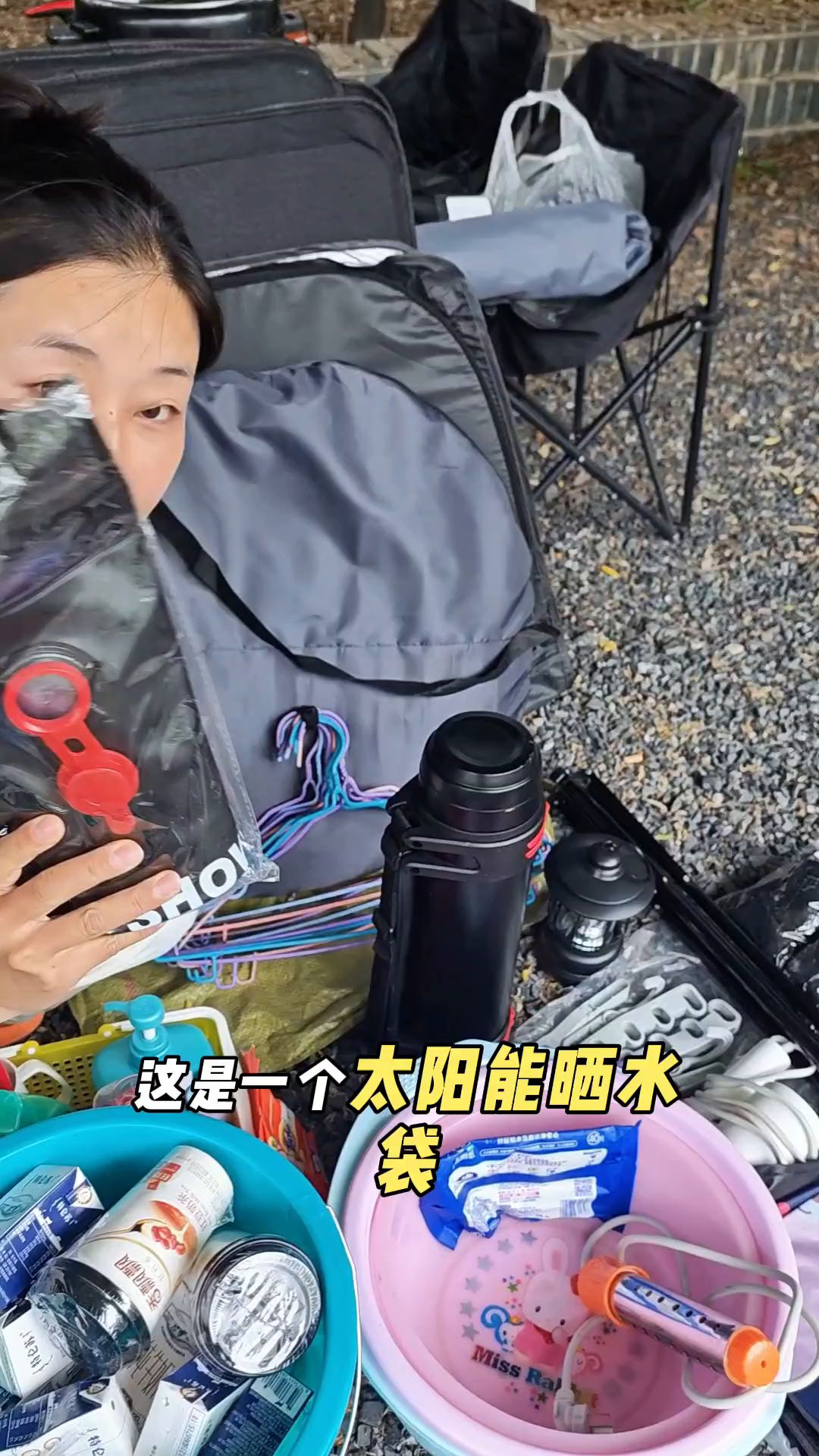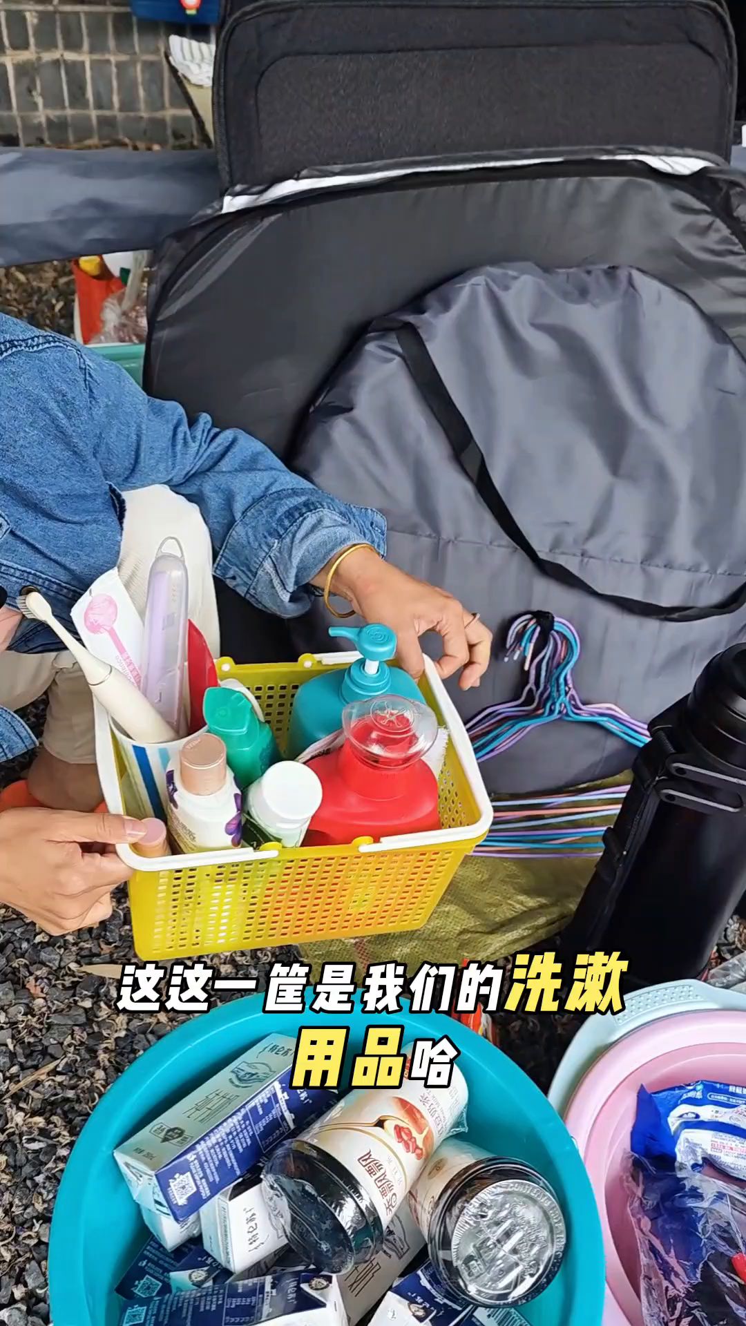 ·先来说一下户外洗澡洗漱需要用到的东西。带了一个桶,三个盆,还有一个晒水袋。这是一个太阳能晒水袋,夏天用挺好的。这个是热得快烧水用的。这一筐是洗漱用品。这个就是洗澡帐篷,非常重要的户外洗澡用的。这是小风扇,夏天都是需要用到的。