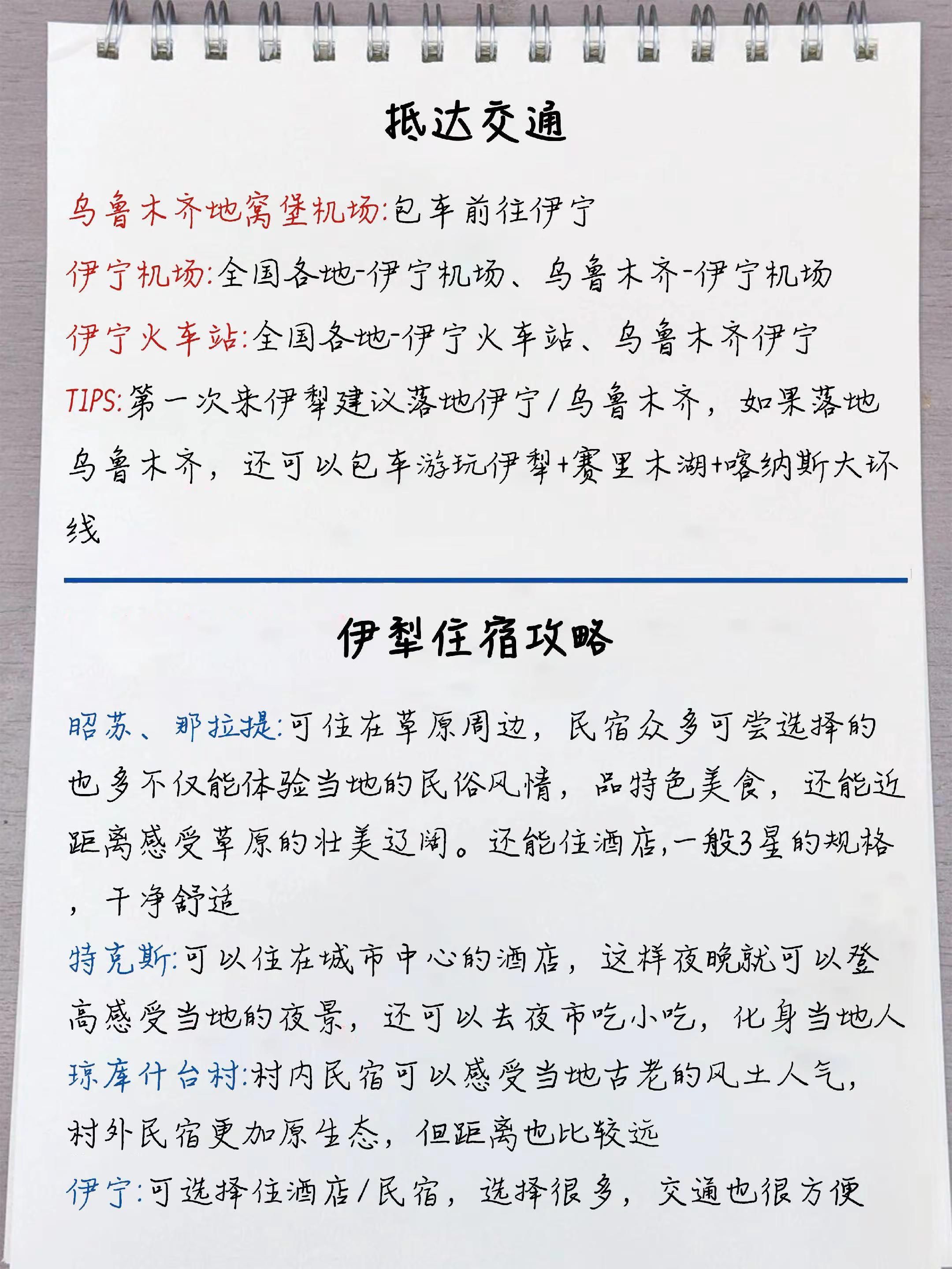 北疆手写版旅游全攻略,5~6月来的姐妹。去新疆旅行的小伙伴,不做攻略真的很容易遇到坑所以这份保姆级游玩攻略一定要收藏-北疆必去的9大景点【恰西】:4月下旬转绿,5月是全绿啦,沉醉于抹茶色草甸与云杉林的怀抱【库尔德宁】不仅有云杉、草原,后山也能看到成片的天山红花【那拉提草原】:小溪、草原、森林、木桥的搭配真的出片!5、6月还有野百合(顶冰花)、蒲公英、小黄花遍地,像铺了一层花毯【喀拉峻草原】:6月再去!“人体草原”线条柔美,牛羊成群,随手一拍都是Windows桌面【赛里木湖】:5月底,湖边的金莲花、野郁金香盛开,湖水蓝得像宝石【独库公路】:每年6-10月通车,沿途雪山、峡谷、草原、森林,真的美哭了【薰衣草花海】:东方普罗旺斯!6月中下旬,霍城的薰衣草进入盛花期,整片田野变成紫色海洋【喀纳斯&禾木】:5月冰雪初融,建议5月底再去,住小木屋看晨雾,太有生活了【夏塔】:向着夏塔腹地、向着冰川深处徒步,连绵的木扎尔特冰川仿佛尽在眼前.北疆(伊犁、喀纳斯、赛里木湖等)5月初仍有凉意,白天温度10~20℃,早晚温差大,可能低至5℃5月下旬气温回升,白天可达25℃,但山区、湖边风大,需备防风外套6月雨水变多,尤其是伊犁地区,随身带一把雨伞.北疆住宿选择伊宁市:六星街周围酒店选择多,交通便利,美食多琼库什台:就去住宿少,进山不容易,建议住一晚再走那拉提镇:民宿较多,价格适中,但旺季需提前预订喀纳斯、禾木:景区内都是小木屋,住宿贵可以选住贾登峪. 北疆7日行程D1:乌鲁木齐-S21沙漠高速-克拉美丽沙山公园-阿勒泰D2:阿勒泰-阿禾公路-托勒海特大草原-通巴森林-途观乌希里克-禾木D3:禾木-喀纳斯湖-喀纳斯三湾-贾登峪D4: 贾登峪-二进喀纳斯-奎屯/胡杨河市D5:奎屯/胡杨河-赛里木湖-薰衣草/六星街-伊宁D6:伊宁-那拉提空中草原-那拉提D7:那拉提-唐布拉百里画廊-独库公园-乌鲁木齐#禾木旅游 #新疆旅游攻略 #新疆阿勒泰禾木