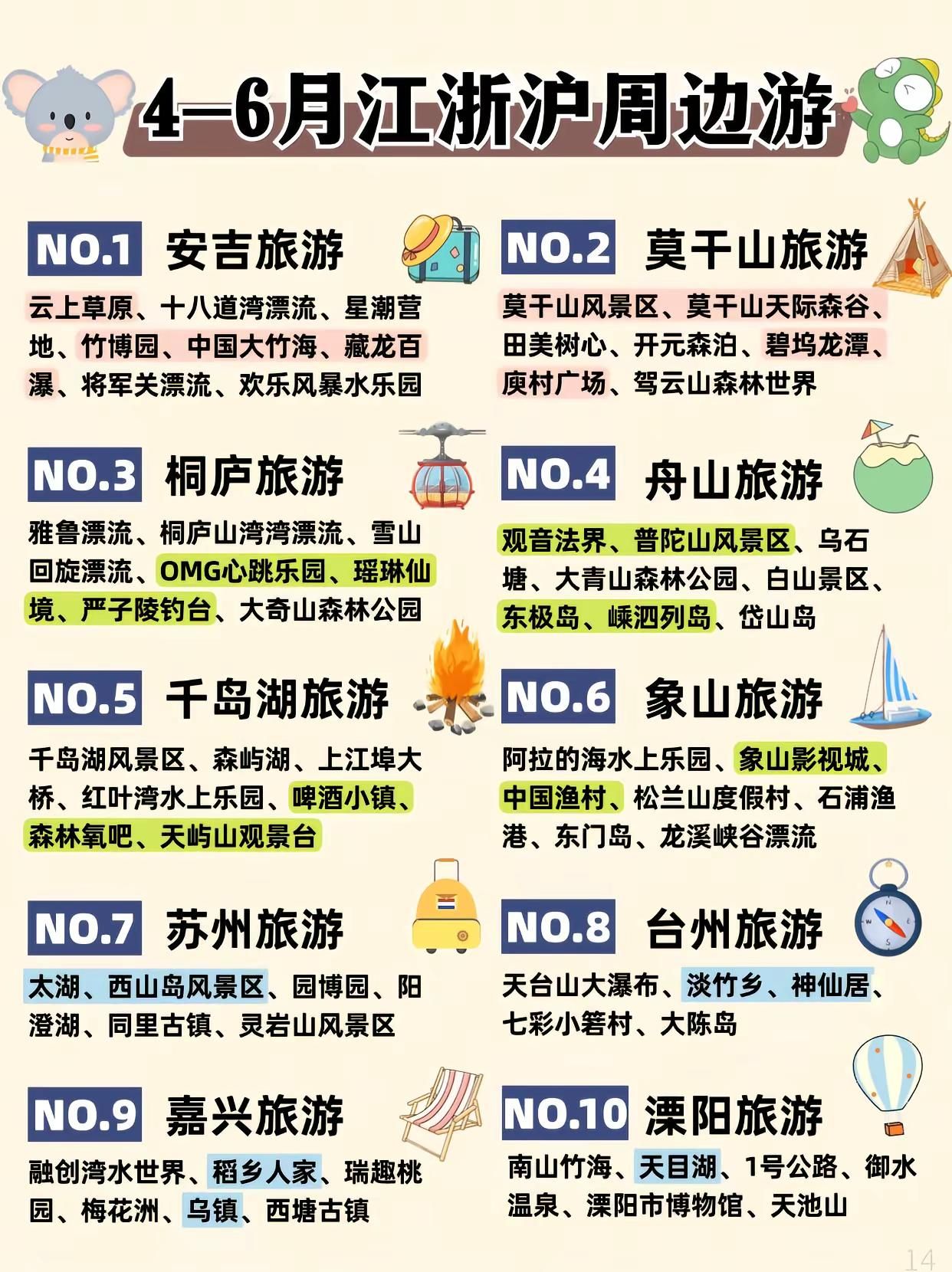 4-6月江浙沪五一假期周边游 。4-6月江浙沪周边游 | 十大秘境保姆级攻略江浙沪山水真的美如画卷!!这辈子一定要去一次!!如果你还在犹豫去哪里玩,不妨看看这篇十大必打卡景点清单快收藏好这份笔记,解锁湖光、竹海、古镇多重玩法-1. 安吉 景点:竹博园、江南天池、云上草原、灵峰寺、Hello Kitty乐园、大竹海 玩法:竹林徒步采风、白茶采摘、山地越野车、星空露营-2. 莫干山 景点:庾村文化市集、天际森谷、剑池瀑布、大斗坞水库、义远有机农场、天泉山 玩法:竹林瑜伽、陶艺手作、热气球观景-3. 舟山 景点:普陀山、东极岛、朱家尖、沈家门渔港、大青山、南沙海滩 玩法:禅修冥想、蓝眼泪夜航、海鲜烧烤DIY-4. 桐庐 景点:OMG心跳乐园、瑶琳仙境、严子陵钓台、垂云通天河、大奇山森林公园、荻浦花海、深澳古村 玩法:溶洞探险、皮划艇竞速、汉服旅拍-5. 千岛湖 景点:梅峰岛、啤酒小镇灯塔、天屿山、文渊狮城、沪马探险乐园、森林氧吧 玩法:环湖骑行、玻璃水滑道、热气球观岛-6. 苏州 景点:拙政园、虎丘、同里古镇、金鸡湖、寒山寺、平江路 玩法:园林剧本杀、夜游古运河、苏绣体验-7. 象山 景点:松兰山海滨、影视城、渔港古城、花岙岛、石浦老街、红岩崖滩 玩法:赶海捕鱼、沙滩运动会、帆船出海-8. 嘉兴 景点:乌镇、西塘、南湖、梅花洲、月河古街、绮园 玩法:古镇汉服旅拍、龙舟竞渡、扎染体验-9. 台州 景点:神仙居、括苍山、国清寺、大陈岛、长屿硐天、石塘古镇 玩法:高空飞拉达、星空音乐会、海岛定向越野-10. 溧阳 景点:南山竹海、天目湖、溧阳博物馆、瓦屋山、御水温泉、彩虹公路 玩法:竹筏漂流、温泉派对、彩虹公路骑行-注:图文来自网络侵删#江浙沪周边游 #江浙沪团建 #周边游好去处 #上海周边团建 #上海团建