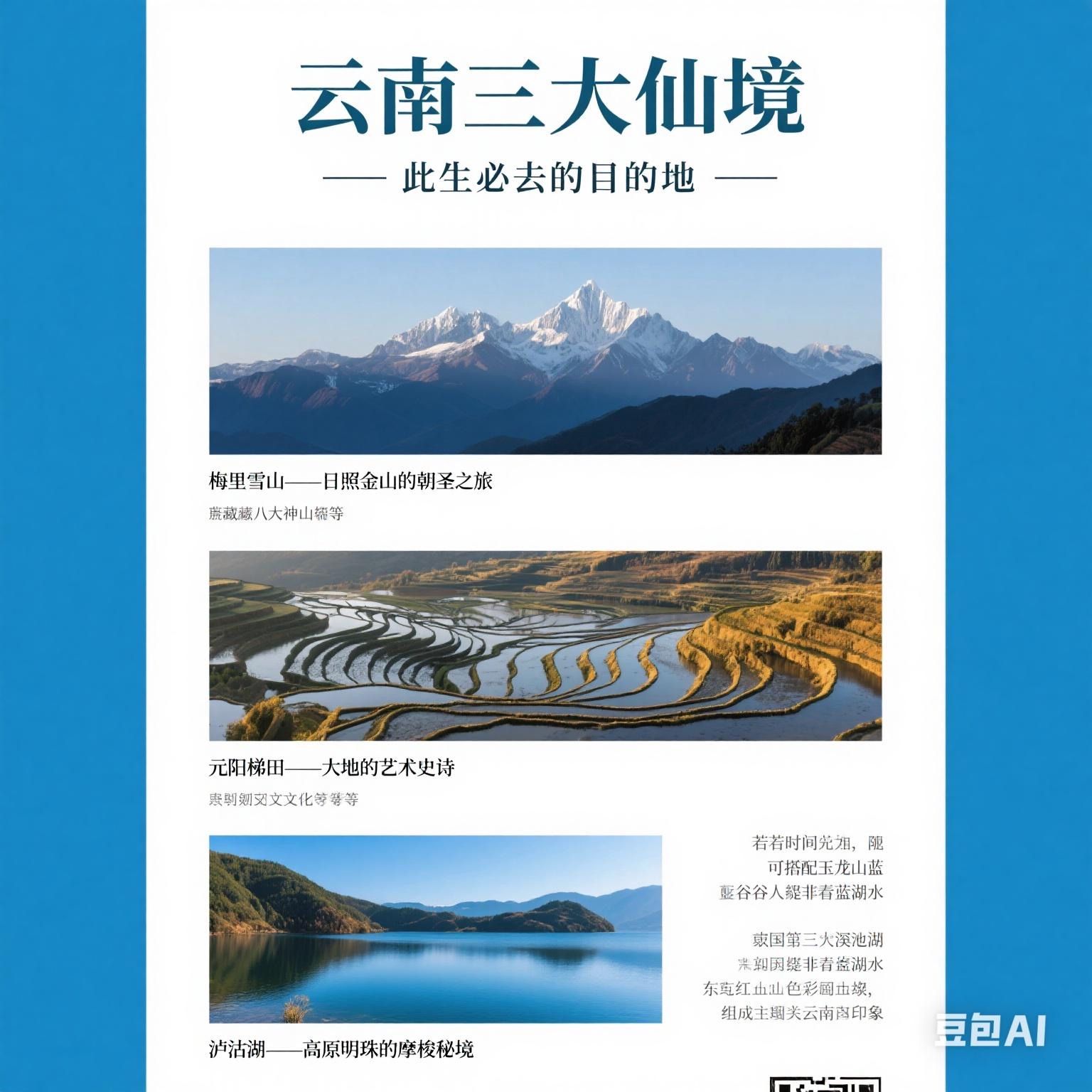 1. **自然与人文的极致平衡**:梅里雪山的神性、元阳梯田的农耕智慧、泸沽湖的母系文化,展现出云南“天人合一”的哲学思想。