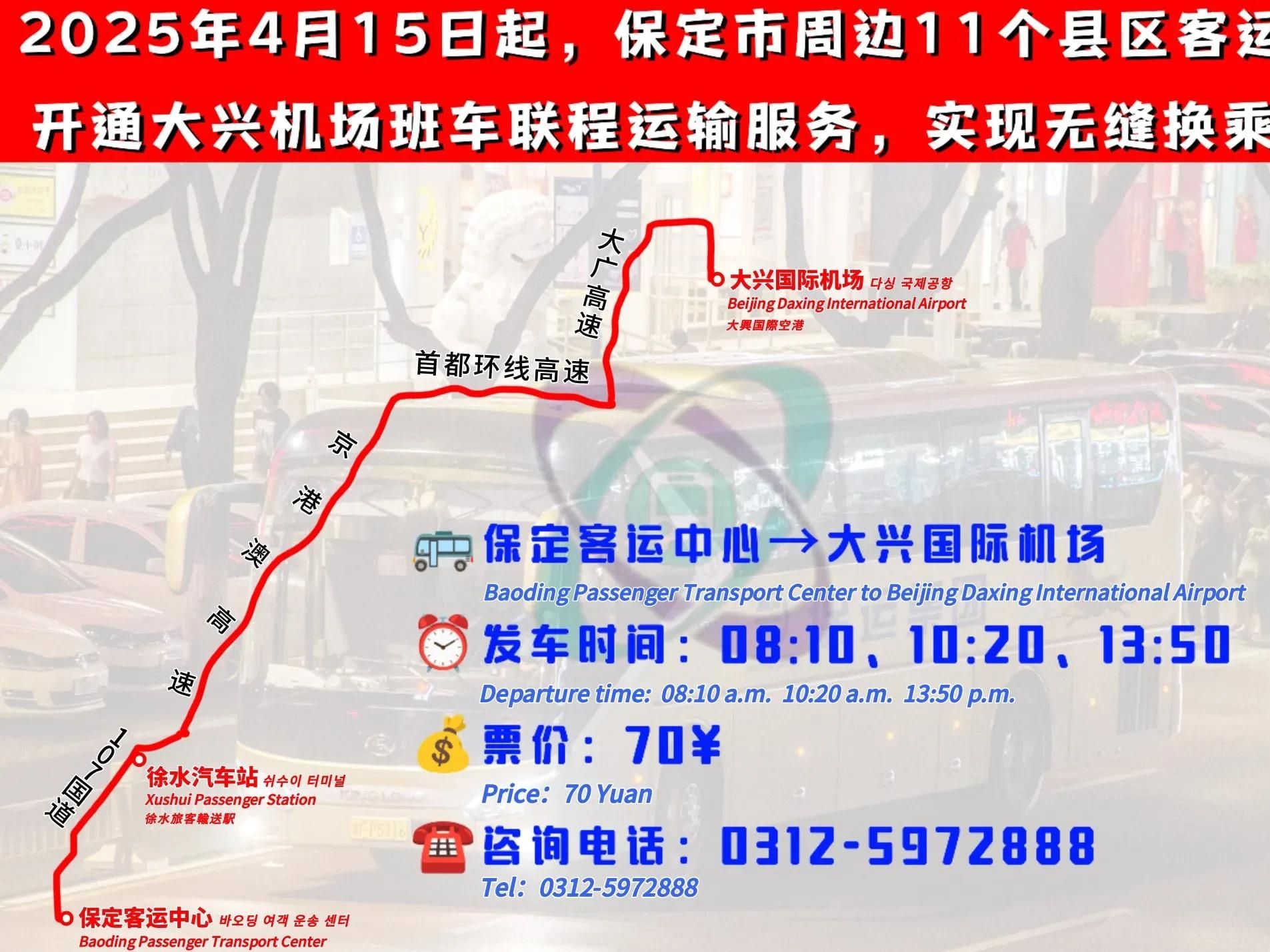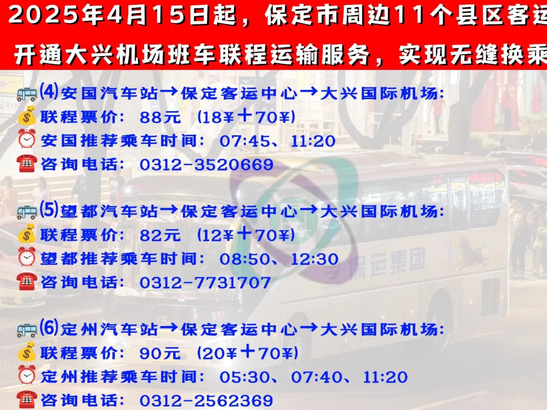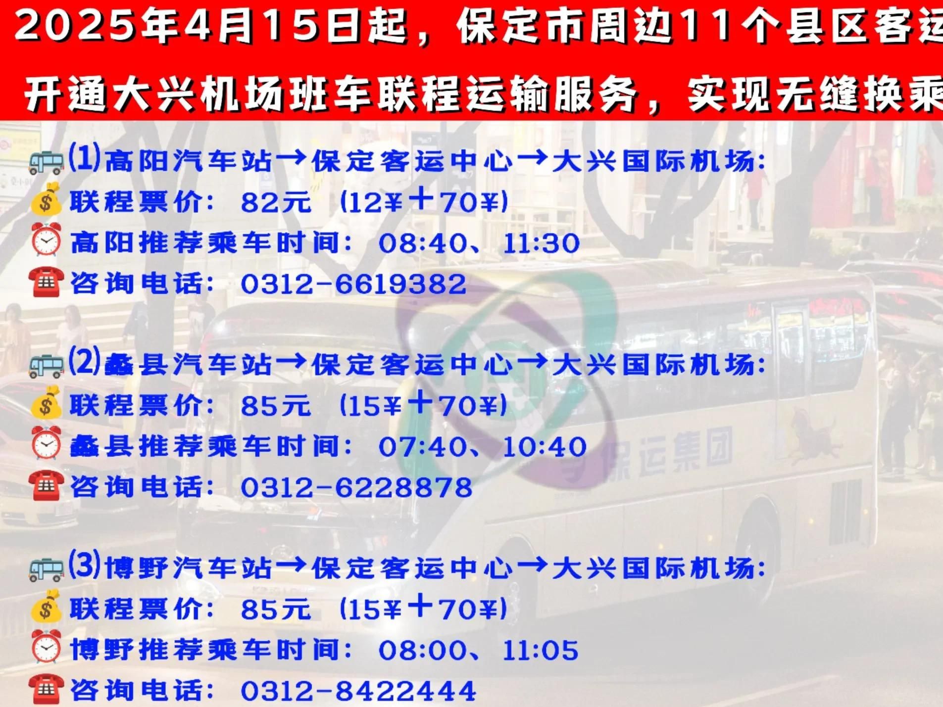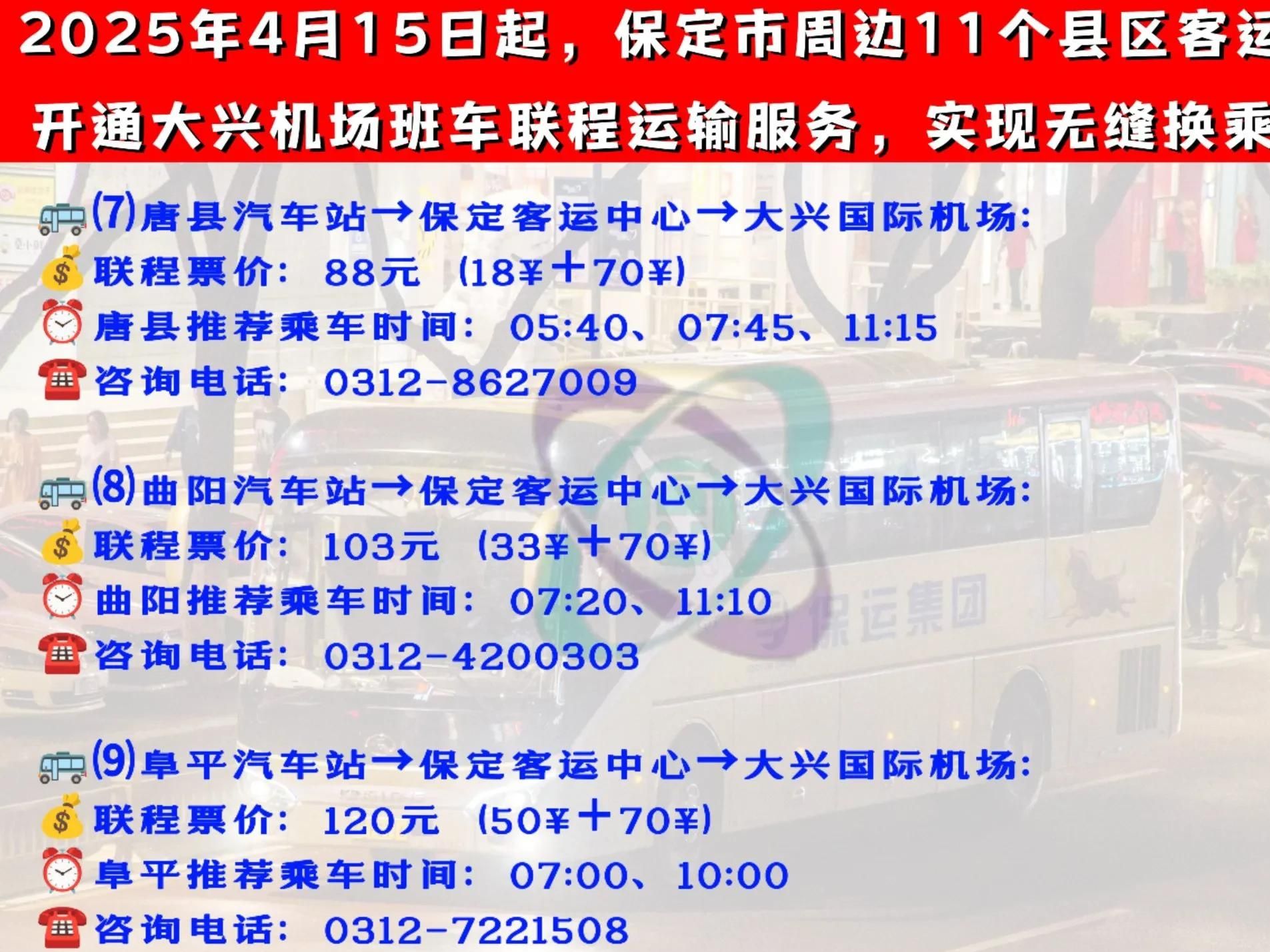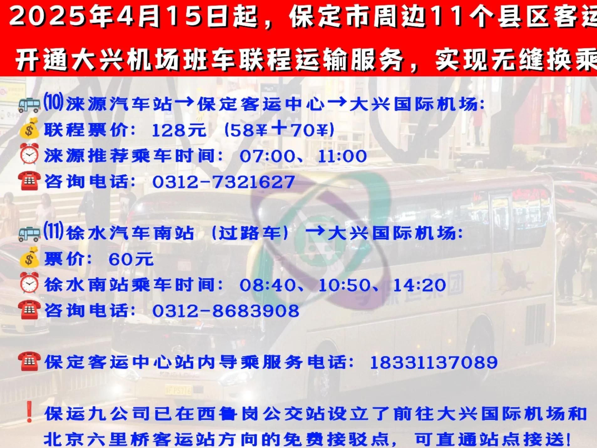 2025年4月15日起,保运集团将依托场站优势和现有线路资源优势,开通由高阳、蠡县、博野、安国、望都、定州、唐县、曲阳、阜平、涞源、徐水11个客运站始发的大兴机场联程服务。