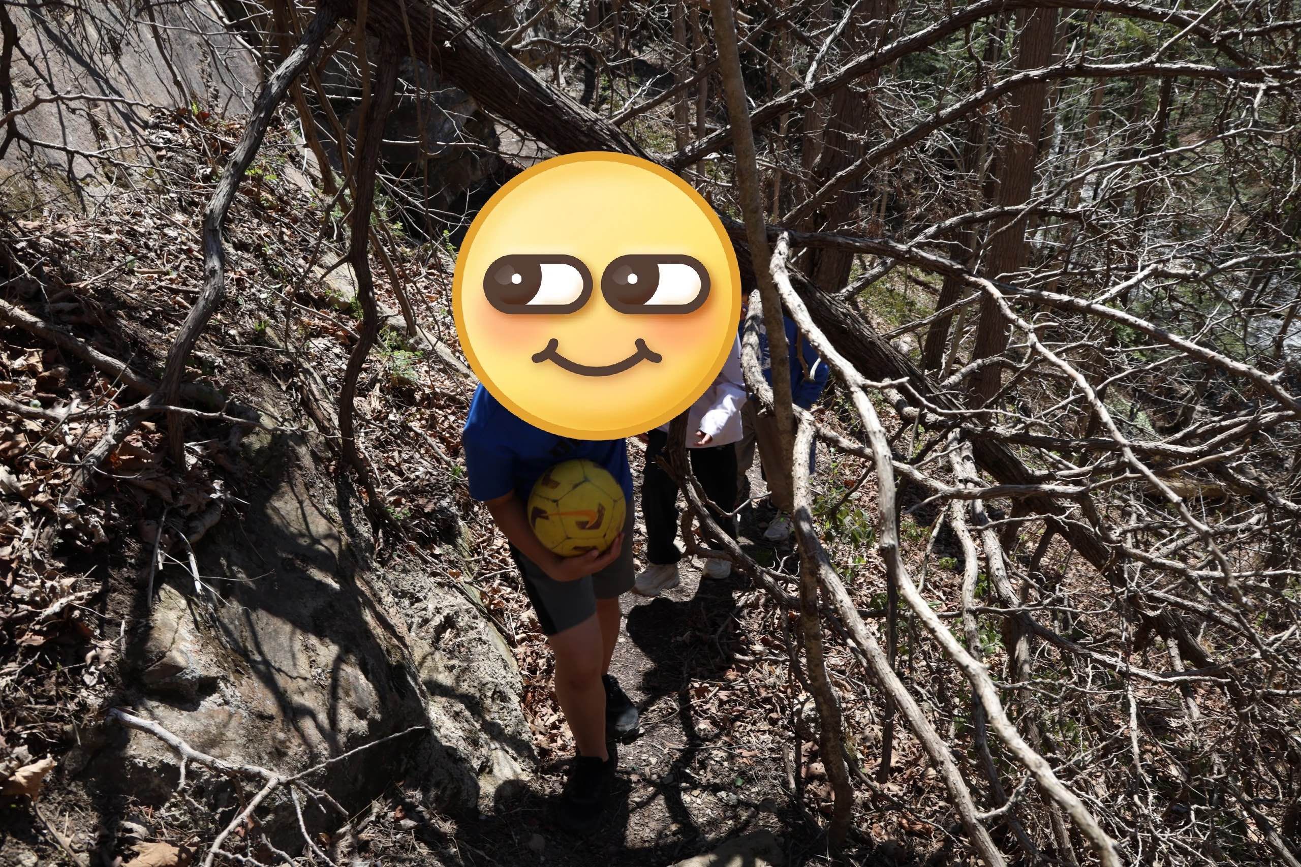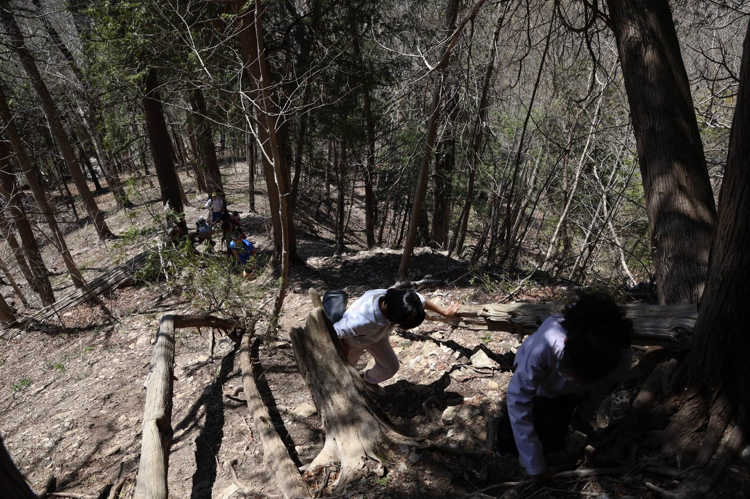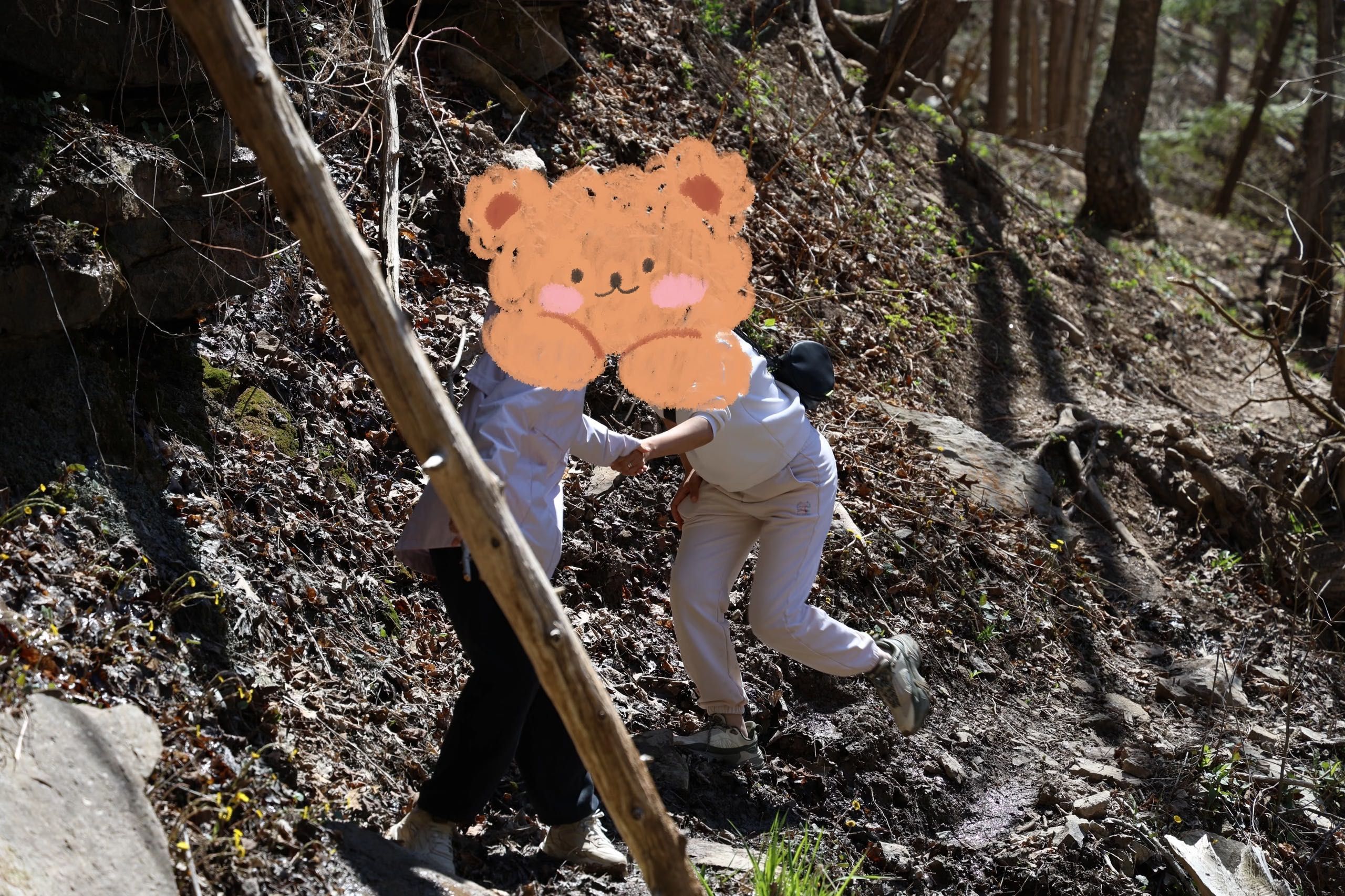 往回走一段后,有一条极陡的坡路直直地往上,大家攀树根、缘石头,人人四驱模式,心有余悸地爬上了岸。好在这段坡不长,但真不能有任何贸然之举。
