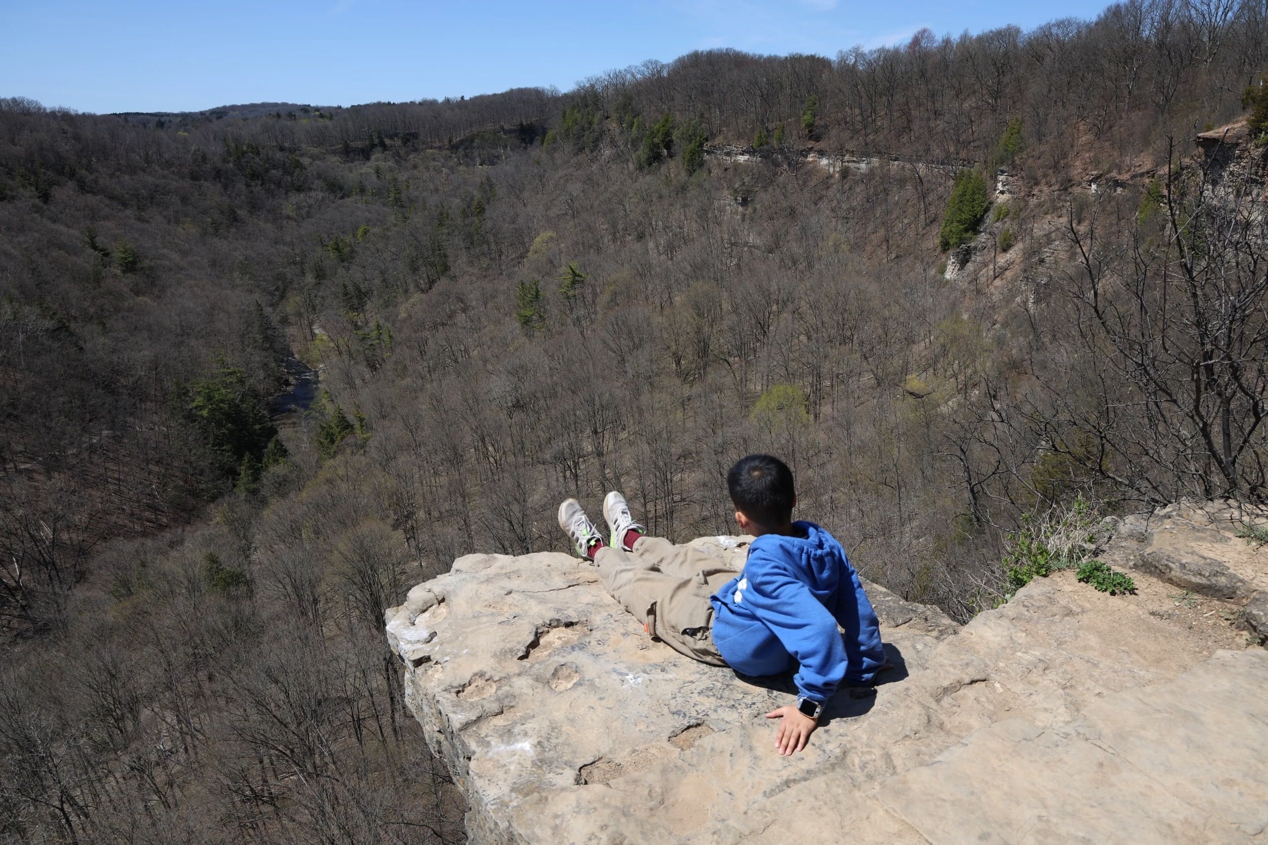 就在我们准备离开的时候,有个老外坐在那片凸石上。同行的11岁Eric也跃跃欲试,那个老外主动让开,并且教Eric可以先蹲下来,再一步一步挪到石尖上坐着。Eric是个学赛车的小伙子,果然胆子很大,两腿悬在空中。我家孩子见状,也去尝试并成功了!