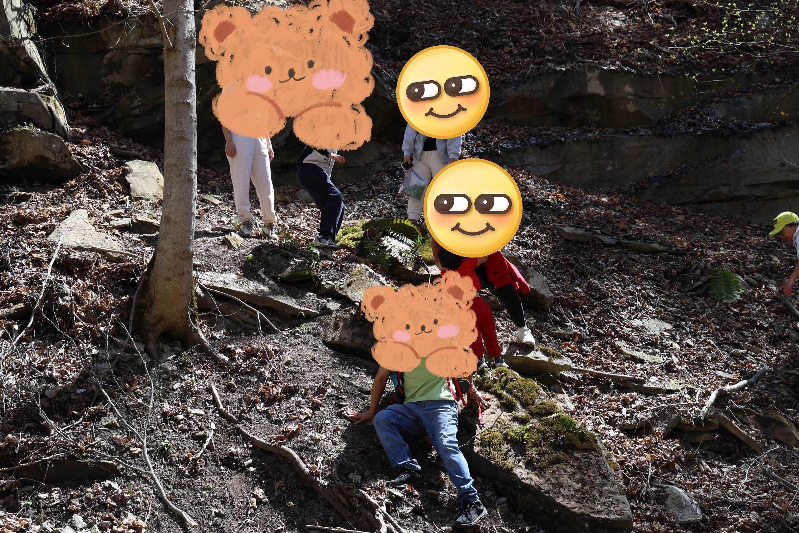 一会儿贴近河边,路也变得更窄,有的地段湿湿的,还生怕陷进去。有两处大偏石,人得低头从它下面走过去,左边就是陡坡,下面是河床,乱石横卧,很是险峻,多数人都得四脚并用。孩子们戏称四驱肯定比后驱给力!
