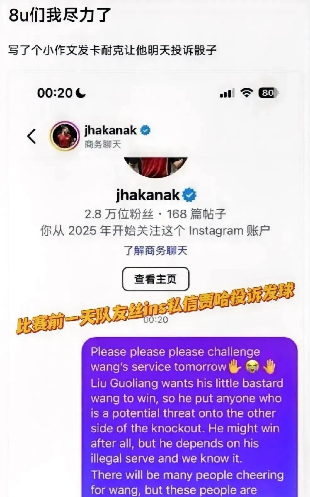 2023年乒乓球世界杯小组赛期间,一封据称由中国球迷撰写的英文邮件曝光。发件人以“中国乒乓球爱好者”名义,向美国选手卡纳克·贾哈提出“战术建议”,称王楚钦的发球存在违规嫌疑,怂恿其“在关键分向裁判提出申诉”,信件措辞激烈,甚至出现“求您维护比赛公平”“中国球迷都在哭泣”等情绪化表述。