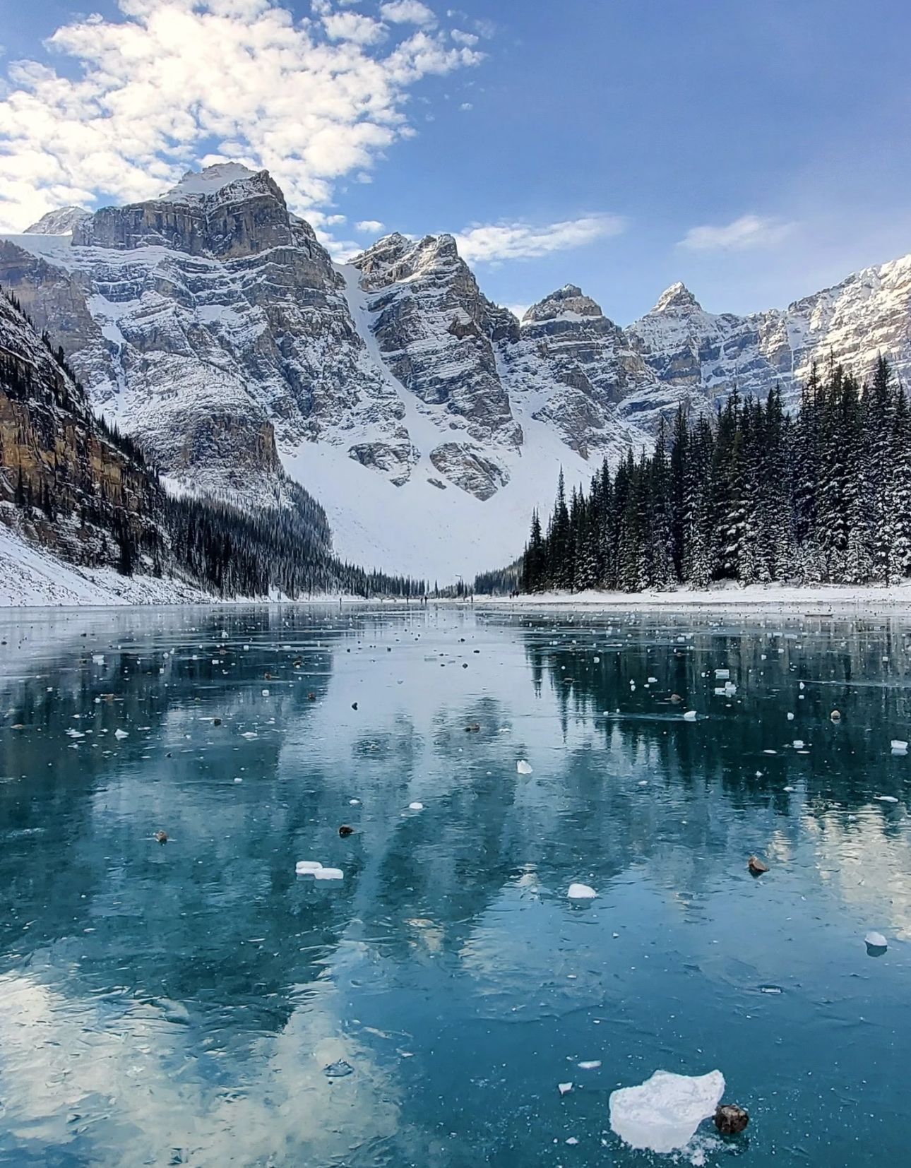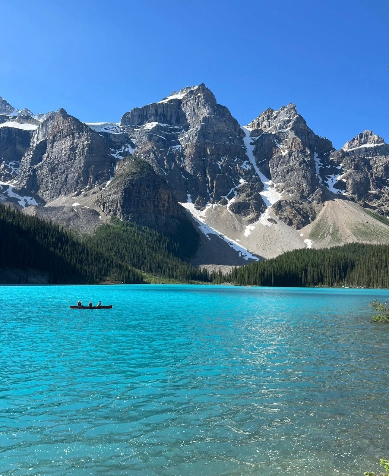 梦莲湖是由冰川活动形成的,由冰碛石堆积围合而成,湖水由于富含矿物质而呈现出变幻莫测的蓝绿色,被赞为“地球上最纯净的蓝色”。湖的周围环绕着十座海拔超过3000米的雪峰(如Deltaform Mt.、Mt.Perren),锯齿状的山形倒映在湖中,恰似一幅灵动的油画。历史上,它的美景曾被印在20加元纸币的背面,还多次成为科技与艺术作品的灵感源泉。
