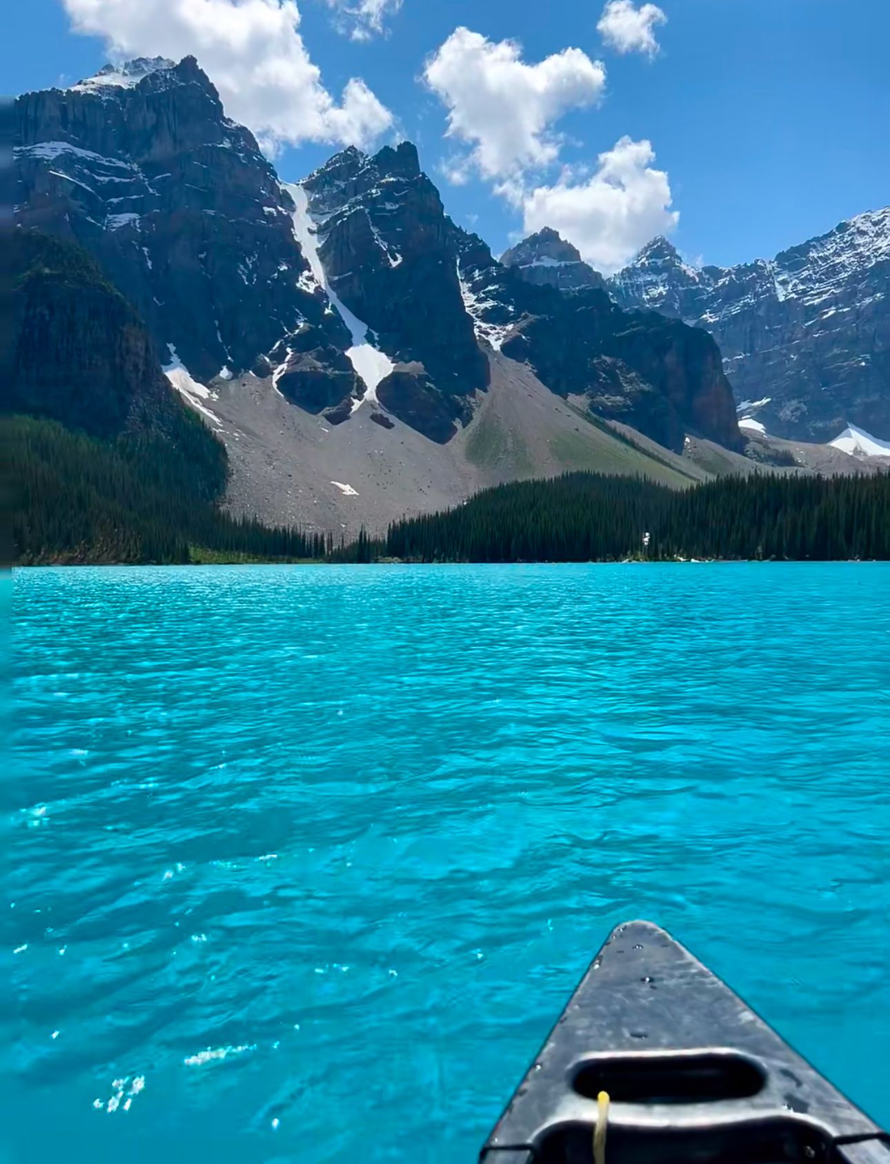 夏季可以在湖边租用独木舟,近距离领略湖水渐变的色彩,湖尾的冰碛石堤是地质奇观的见证。