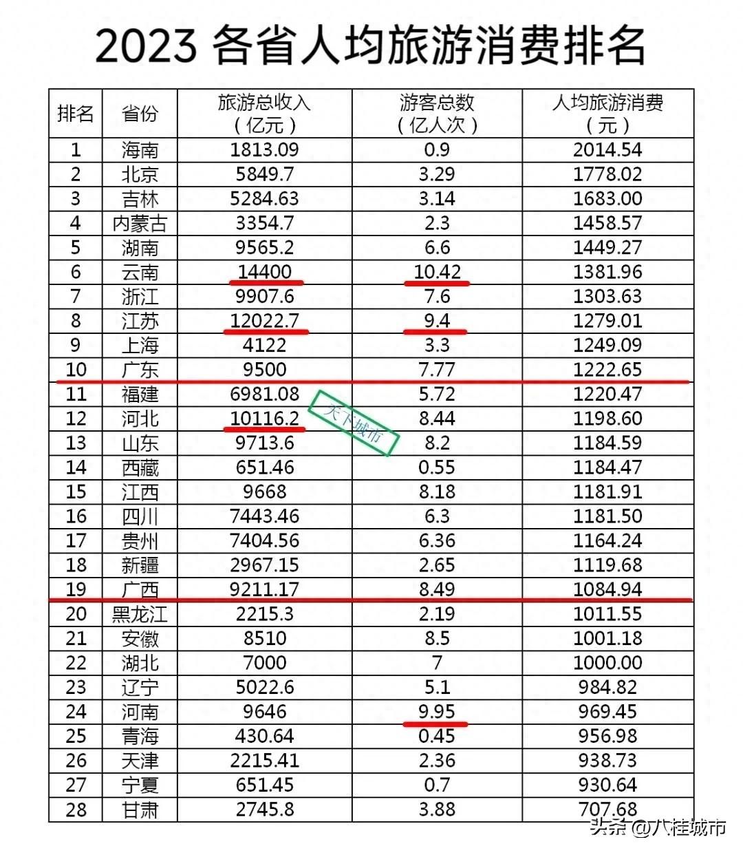 2023年广东人均旅游消费1223元,排名第10。广西人均旅游消费1085元,排名第19。