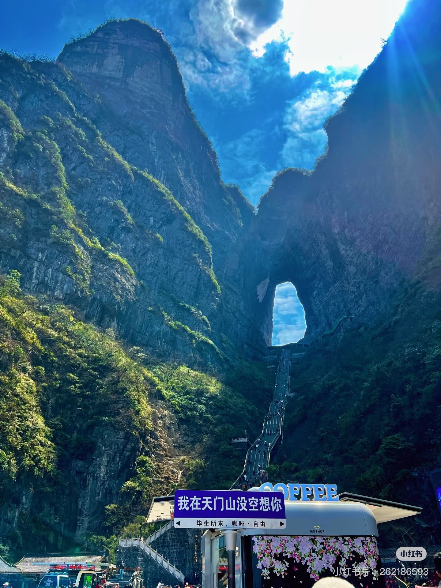 下午:乘坐穿山扶梯到达天门洞,在天梯上拍照留念,欣赏天门洞的神奇壮观,最后乘坐天门洞快线索道下山。