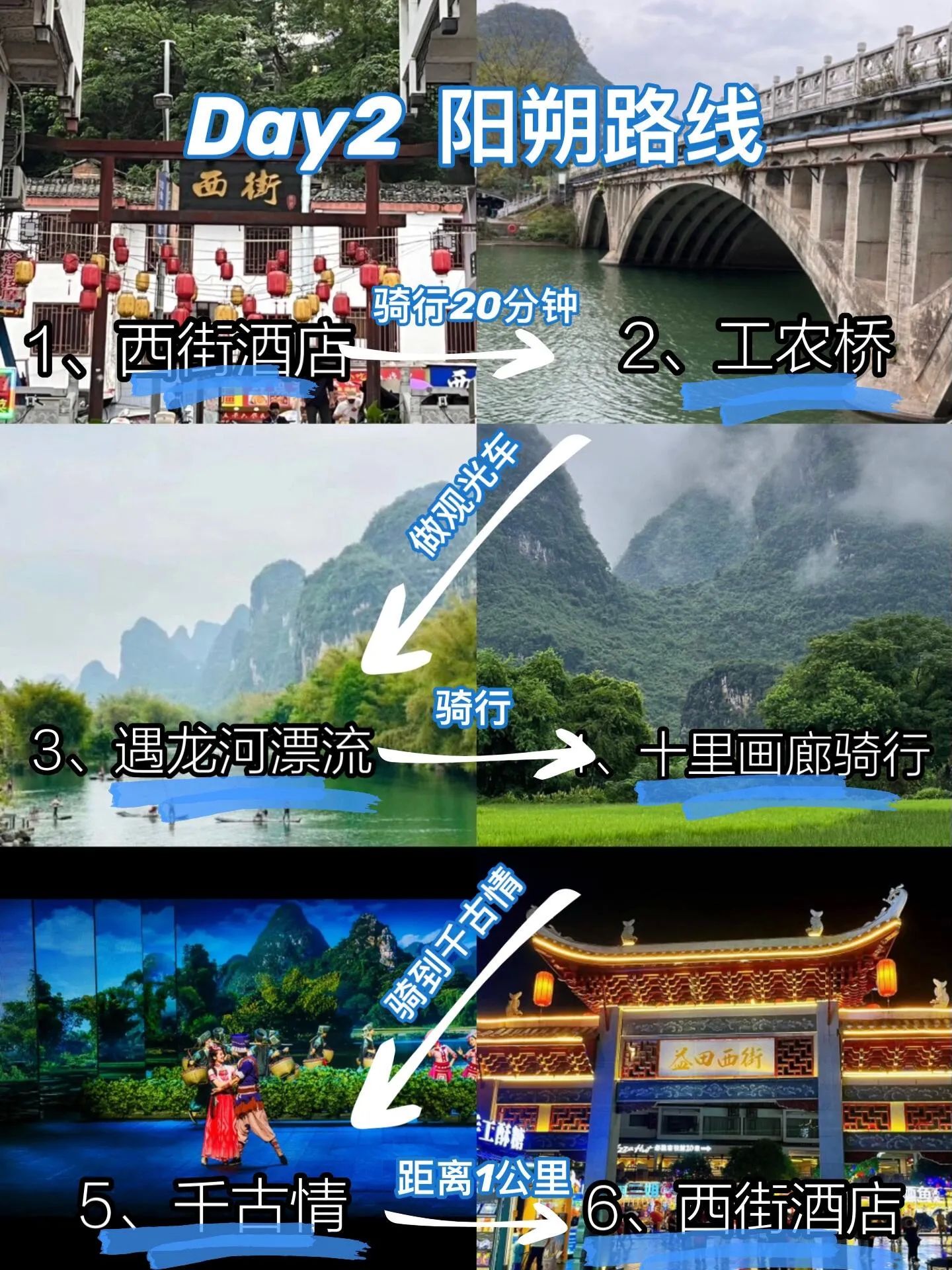 交通:高铁或打车前往阳朔,入住西街附近酒店,租一辆电动车开启自由行