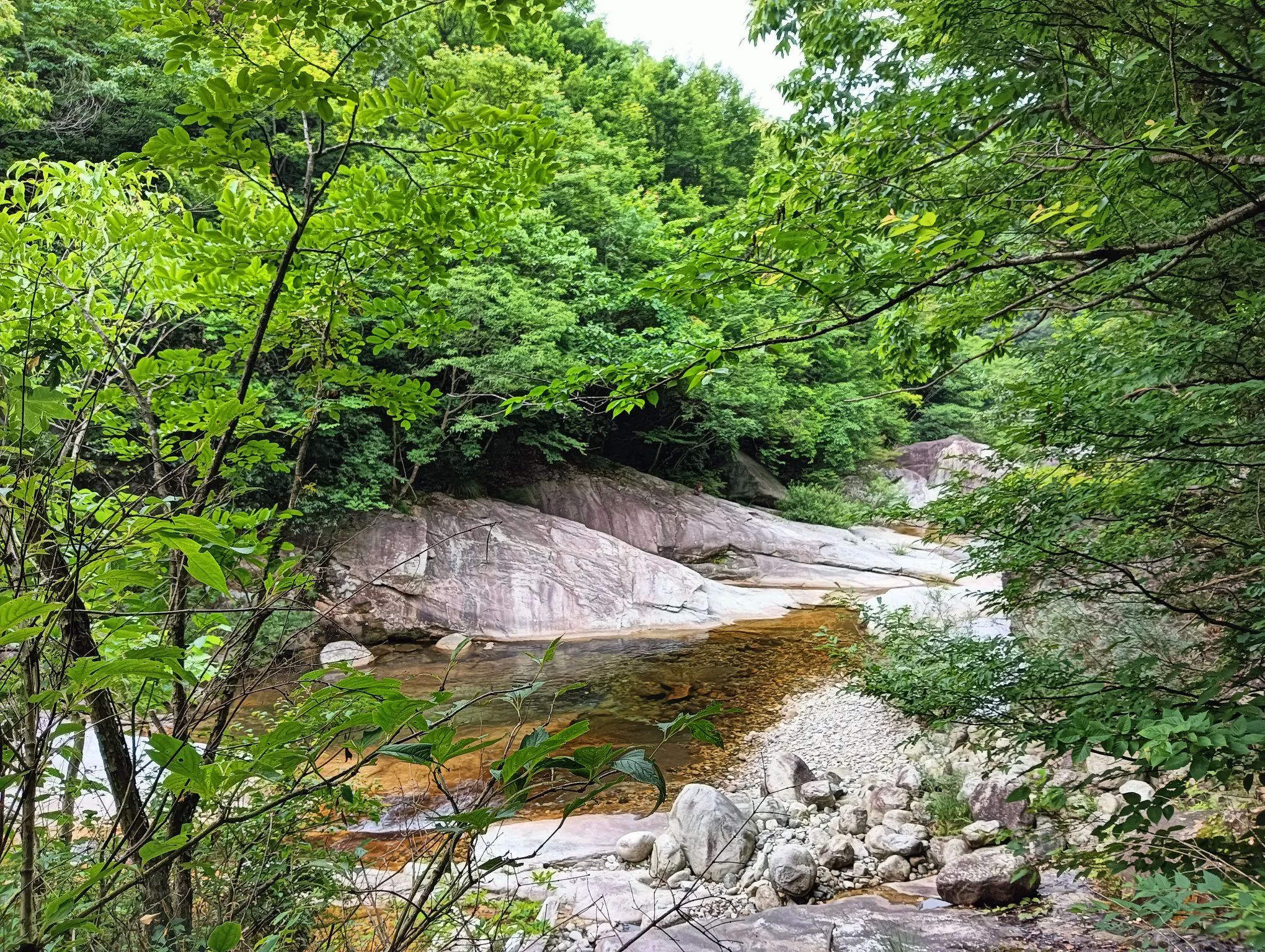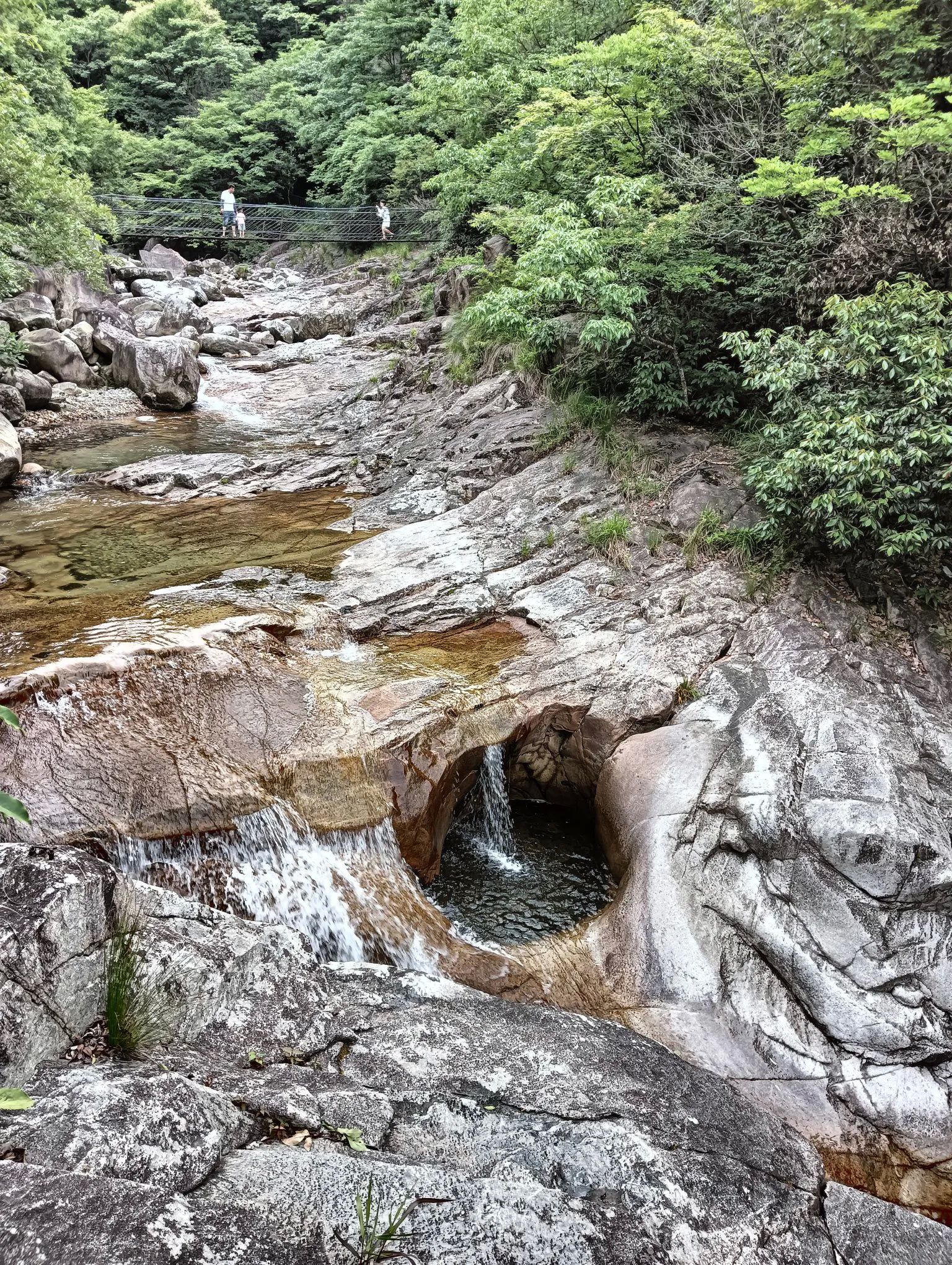 图5、是峡谷中著名的景点“圣水洗白马”,一条约五六十厘米宽的白色花岗岩从麻岩之中穿过,切断山脉,跨过溪流,很是壮观,犹如白马戏水濯身。