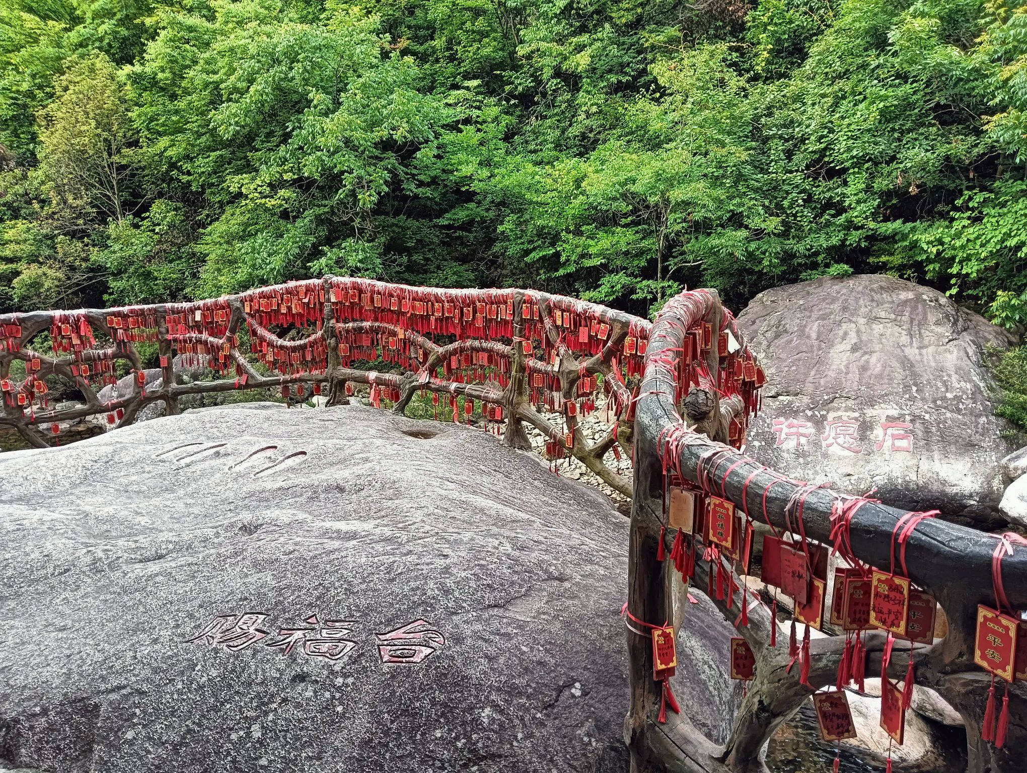 图16、溪水这边是赐福台,那边是许愿台,两石隔河相望,护栏上挂满了许愿牌。