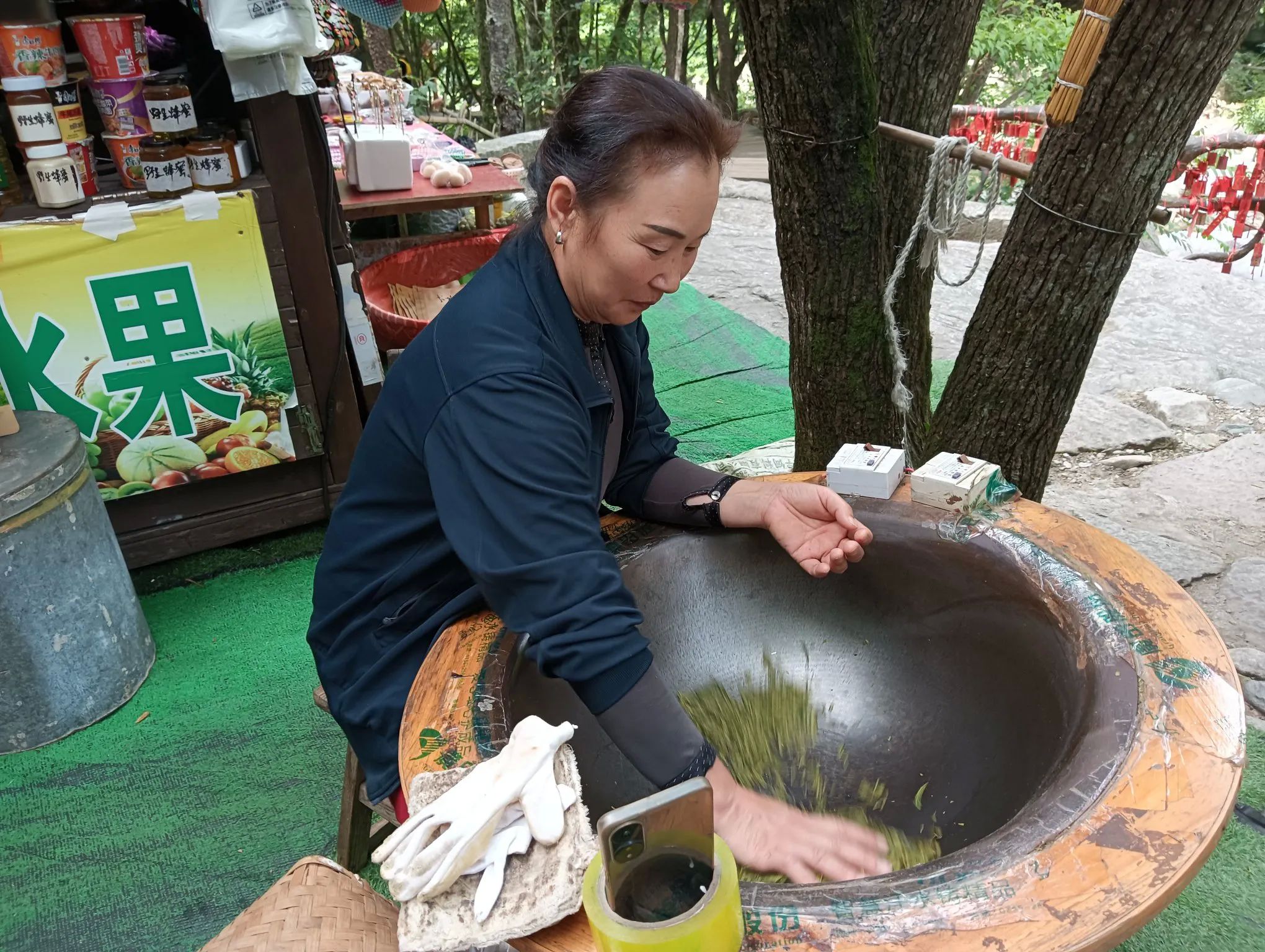 图18、当地茶农在炒茶。到处的风景区都一样,出口设有出售土特产的商铺和街道,你不买,圈也得转,长街你得走。