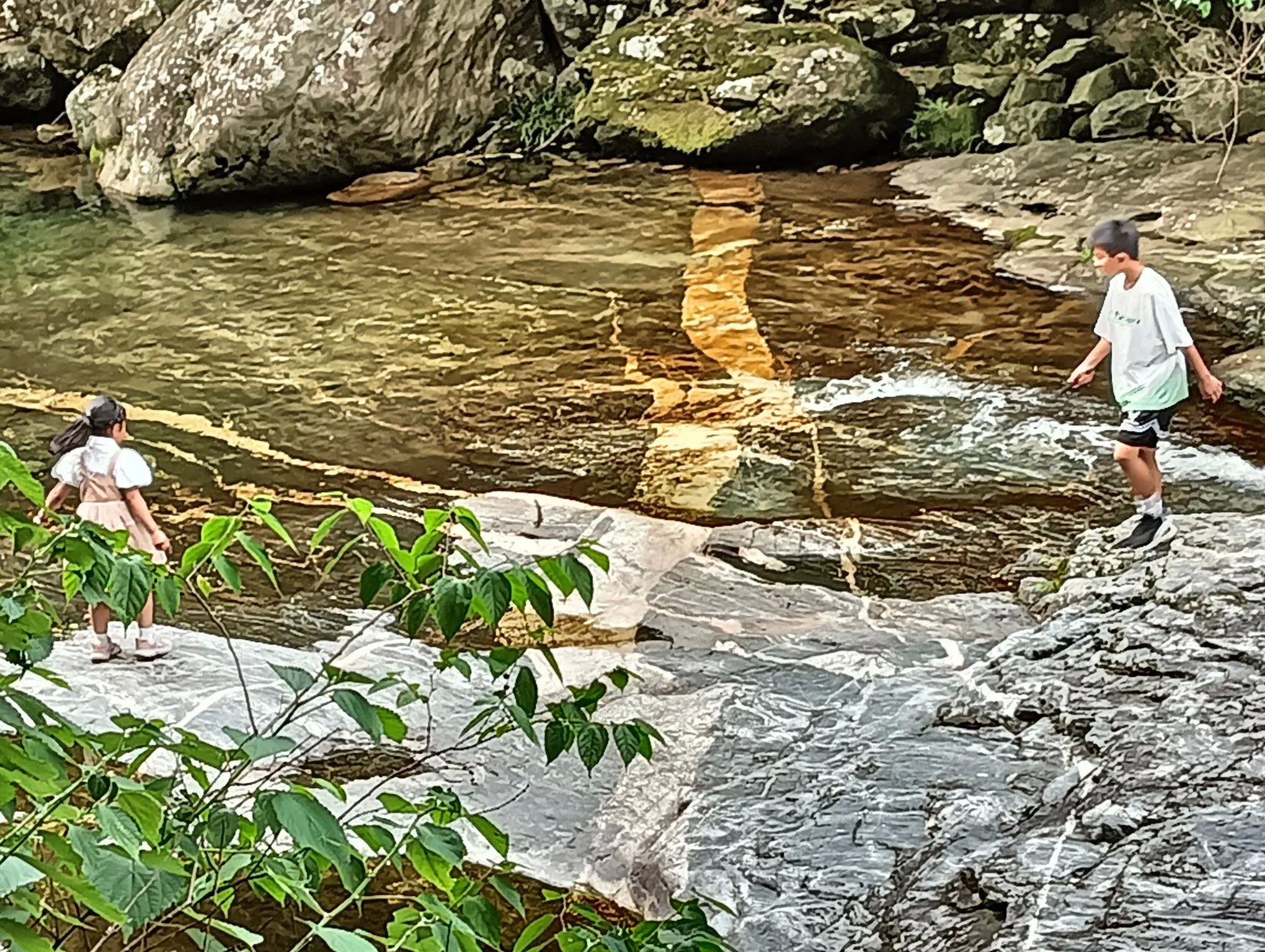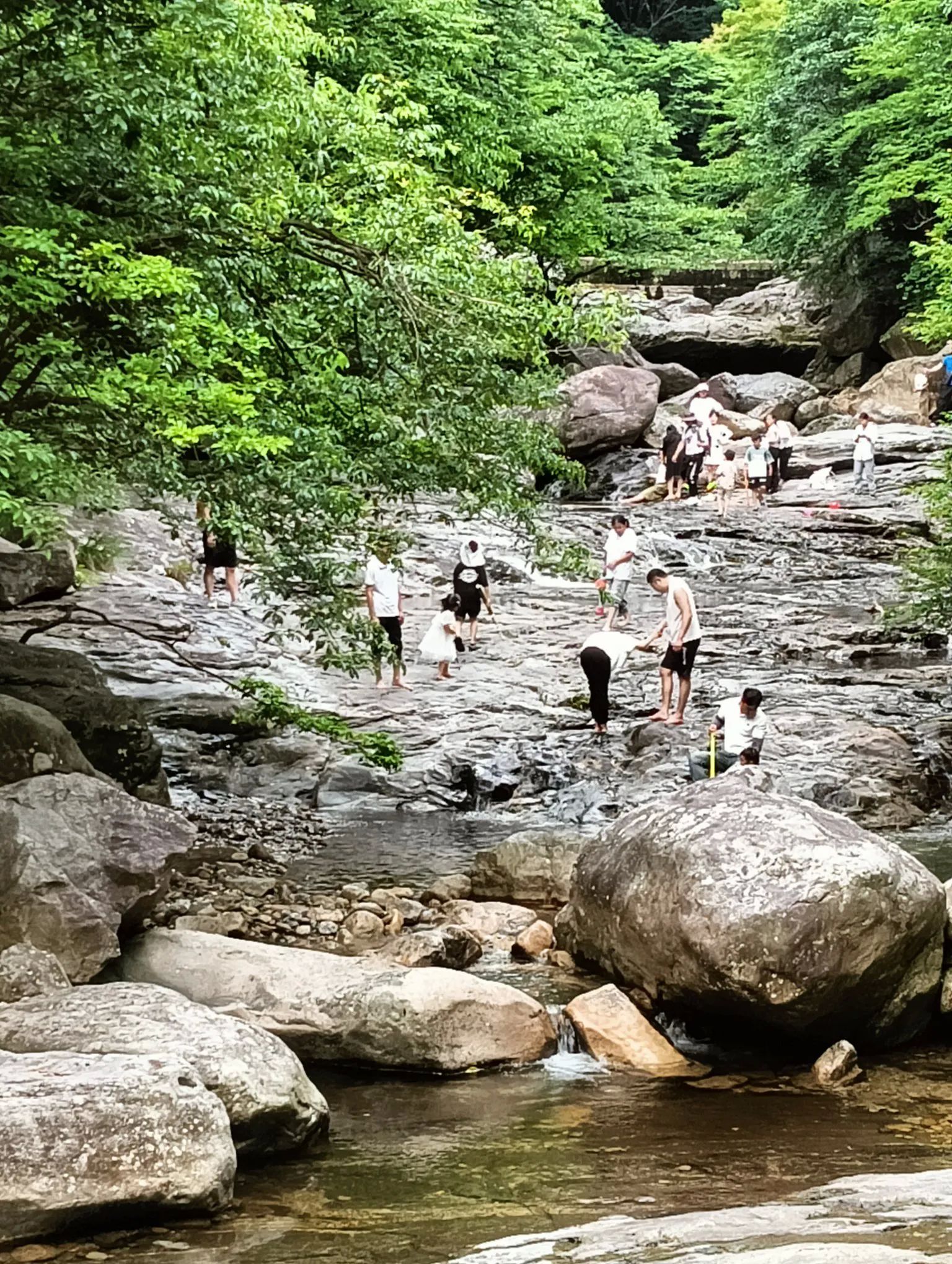 图4、一个小岔溪中,因近期雨少水而小,游人们带着孩子在乱石滩中踩水玩耍。