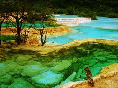 4. 黄龙风景名胜区:位于阿坝州松潘县,以钙华梯田五彩池为主要看点,还有原始森林。乘坐索道上山直奔五彩池,然后反向游览可避开人潮,独特的钙华地表遇水后就像溜冰场。