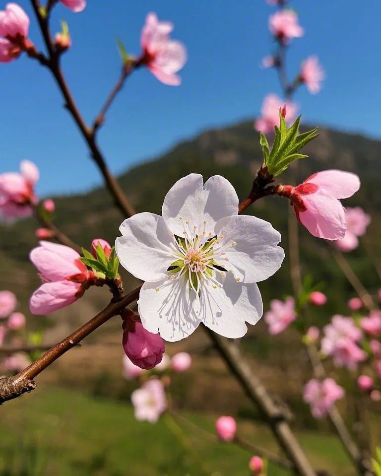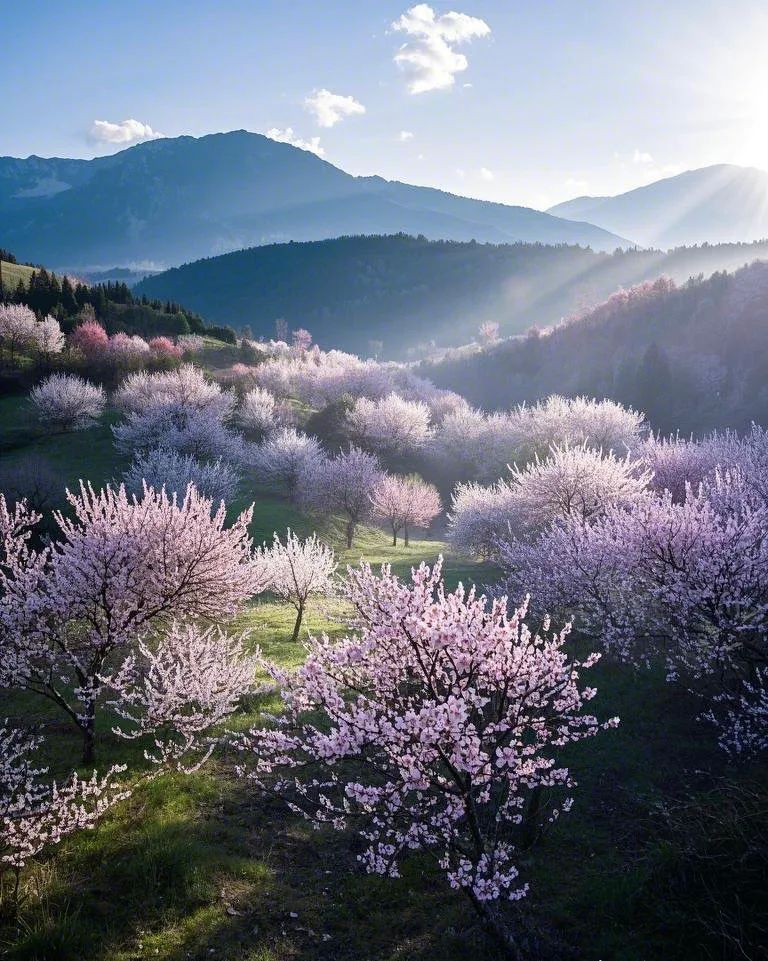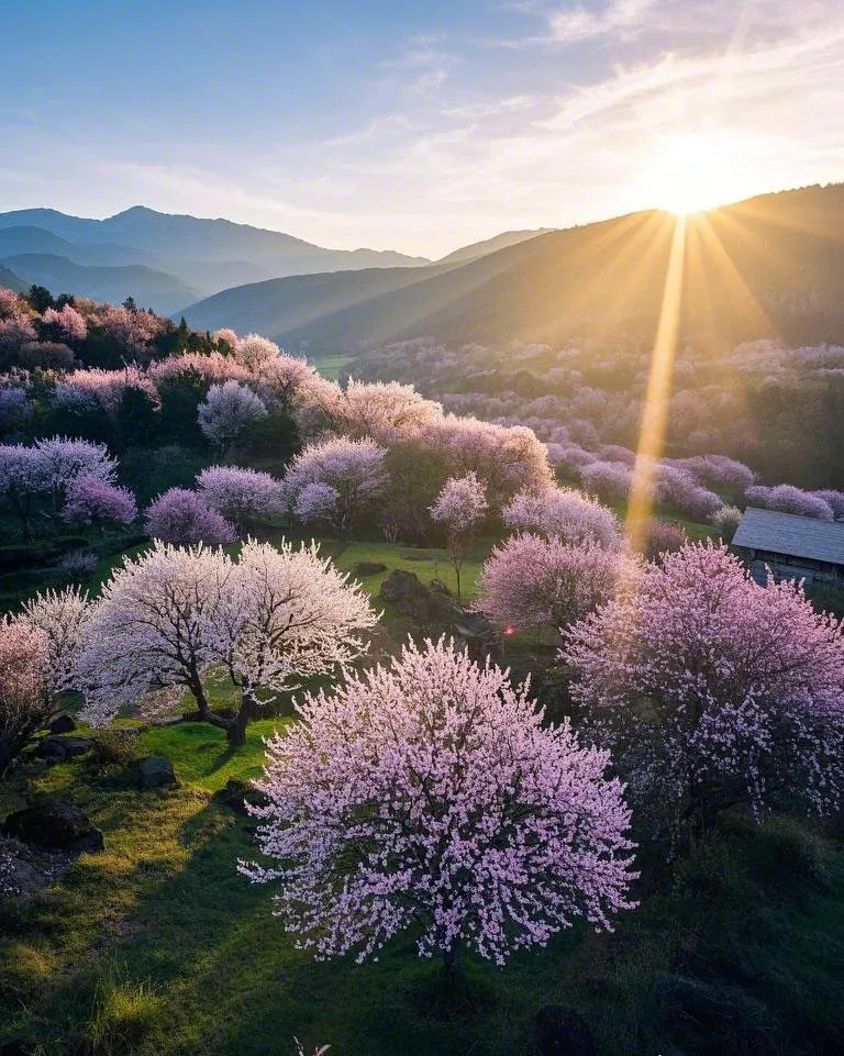 **特色**:桃花覆盖山野,形成粉红色飘带,与民居、蓝天构成诗意田园。