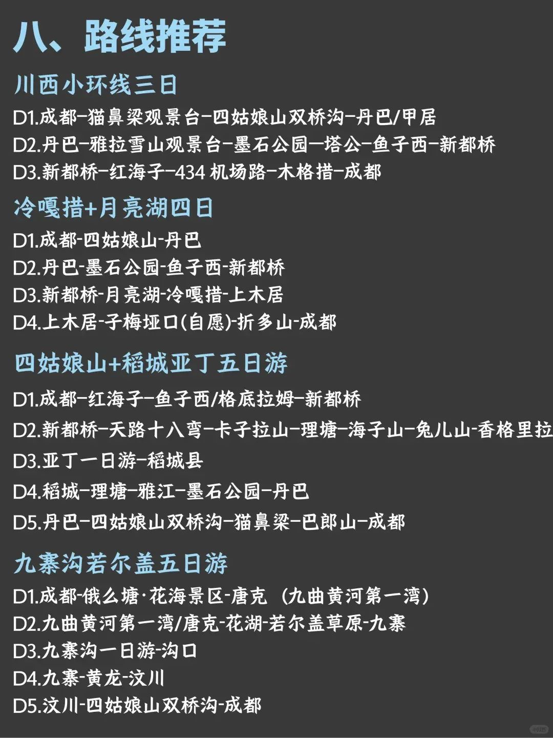 第一天从成都出发,途径红海子,之后前往鱼子西或格底拉姆,欣赏完美景后前往新都桥。第二天,从新都桥出发,沿着天路十八弯前行,经过卡子拉山、理塘、海子山、兔儿山,最后抵达香格里拉镇。第三天,在稻城亚丁景区游玩一天,感受牛奶海、五色海等景点的魅力。第四天,从稻城出发,途径理塘、雅江、墨石公园,最后到达丹巴。第五天,从丹巴出发,前往四姑娘山双桥沟,之后经过猫鼻梁、巴郎山返回成都。