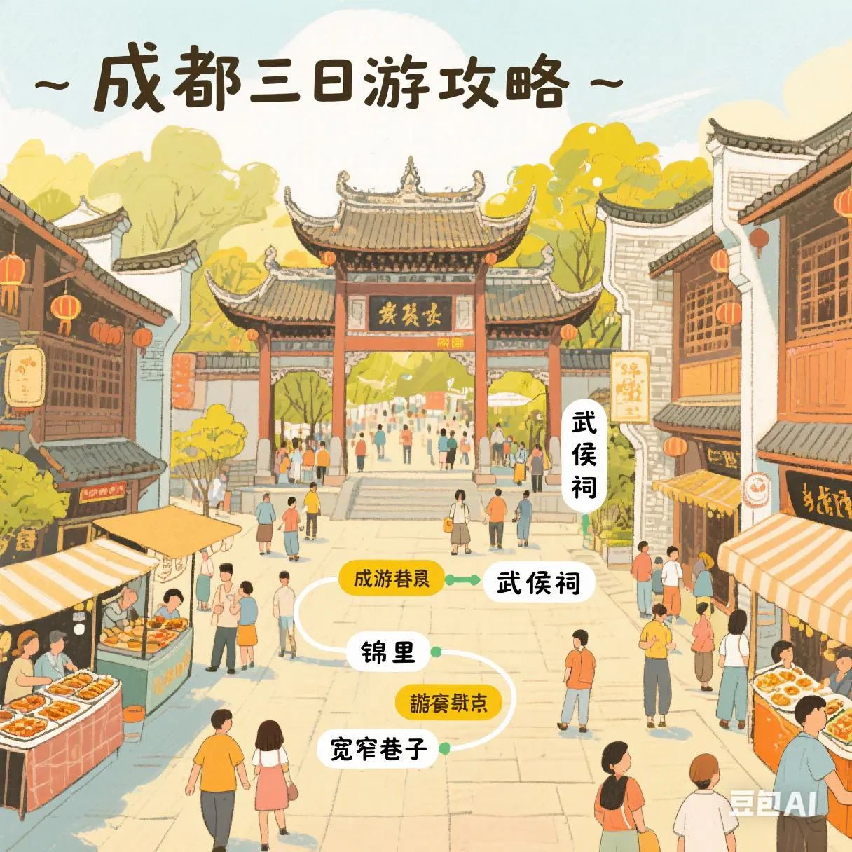 - 景点:锦里古街就在武侯祠旁边,有很多古色古香的店铺和小吃,能体验到成都的传统民俗和风情。